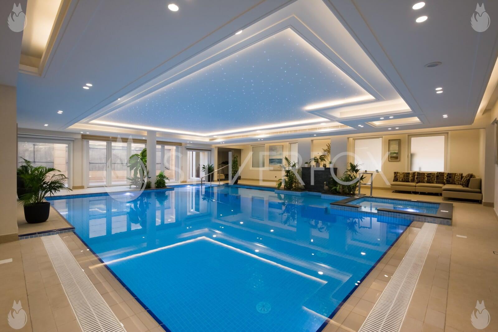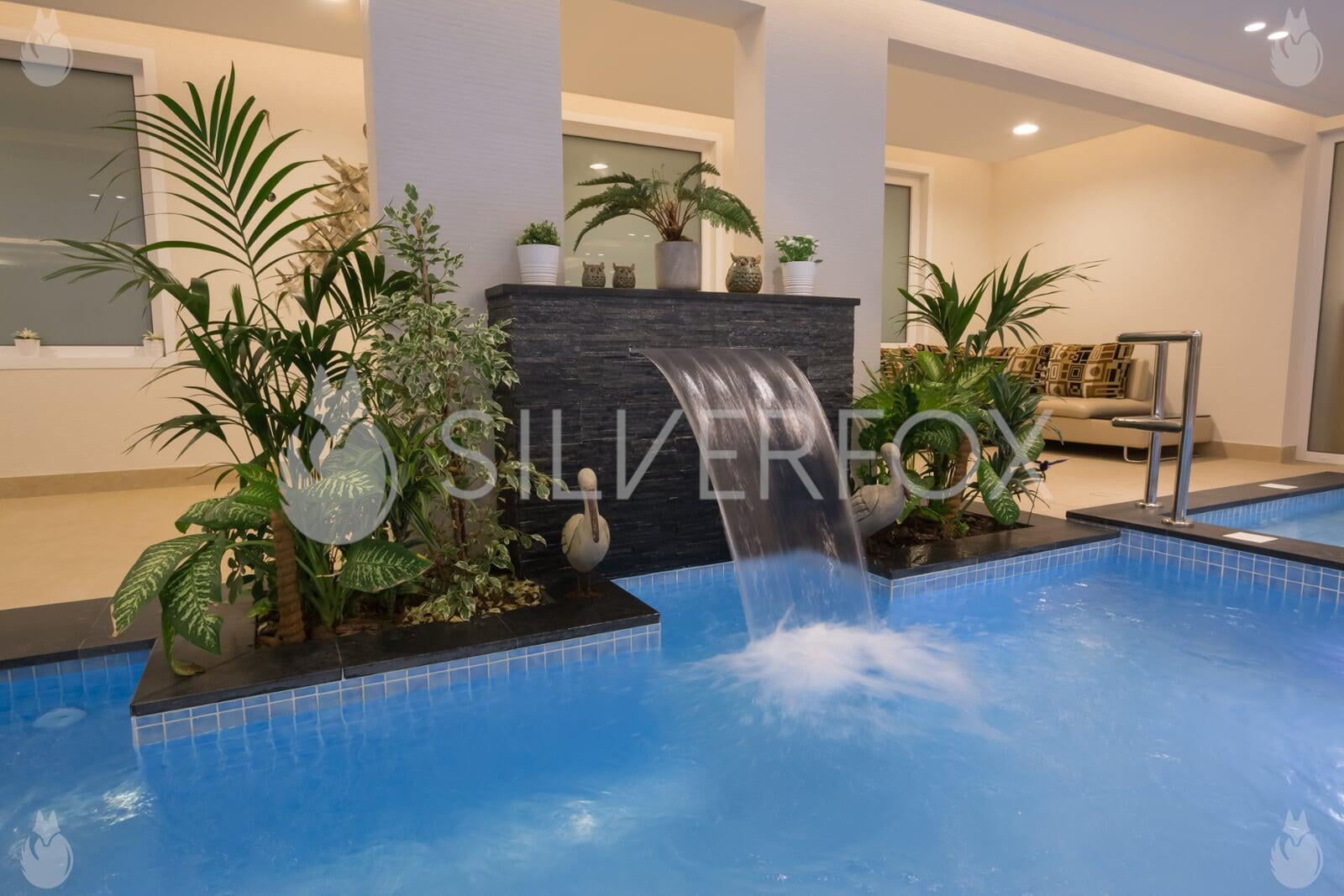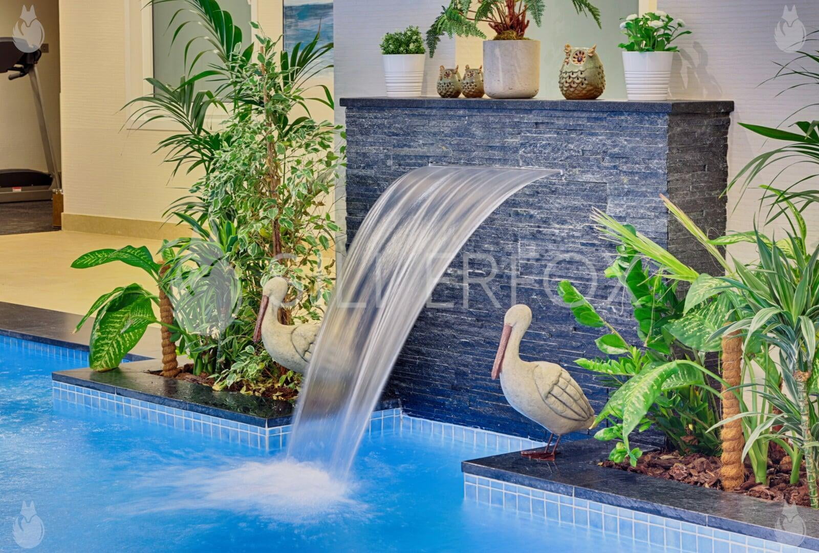 Residential Indoor Overflow Pool with Spa, Submerged Stepping Stones, Underwater Seats, Steps, & Water Feature