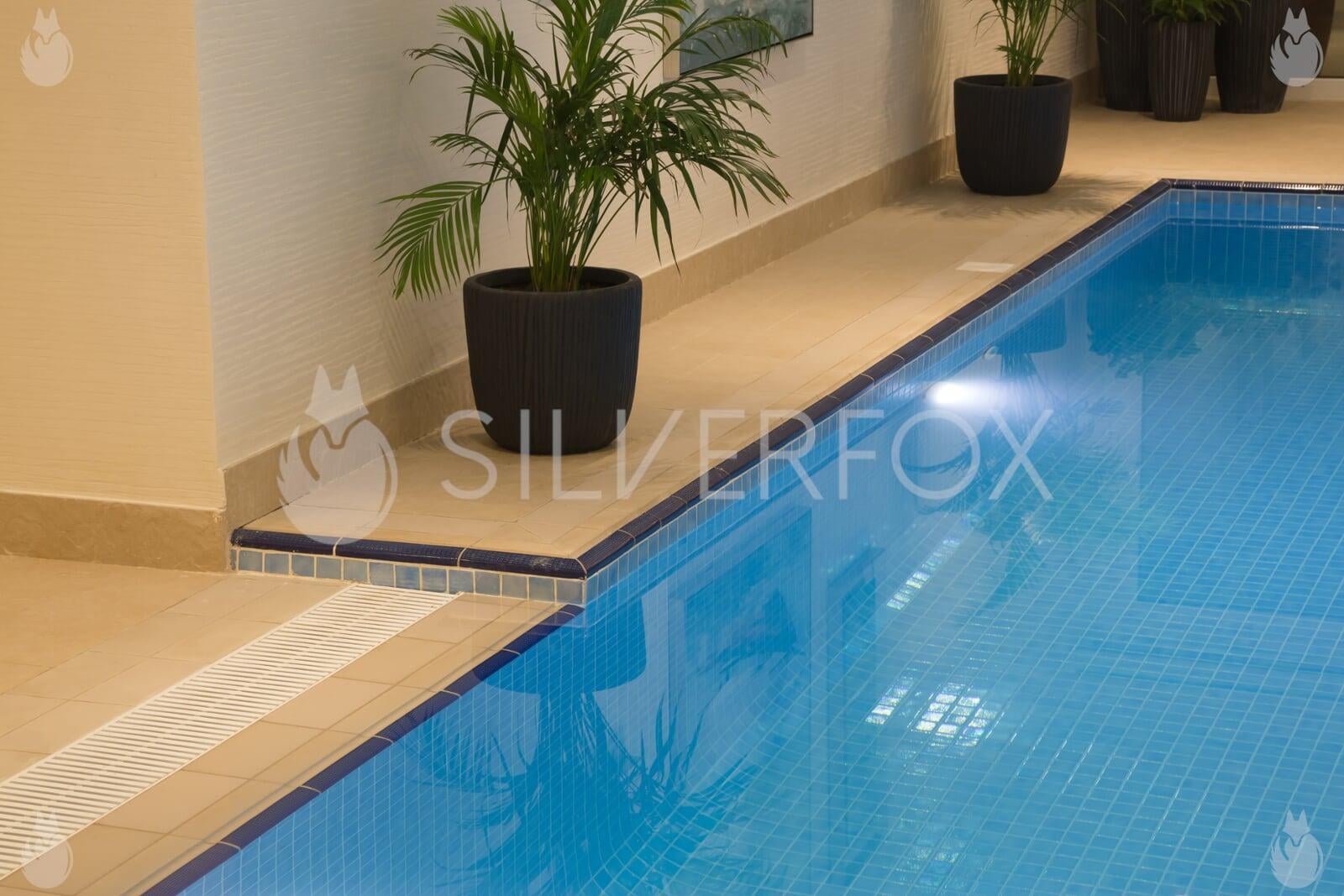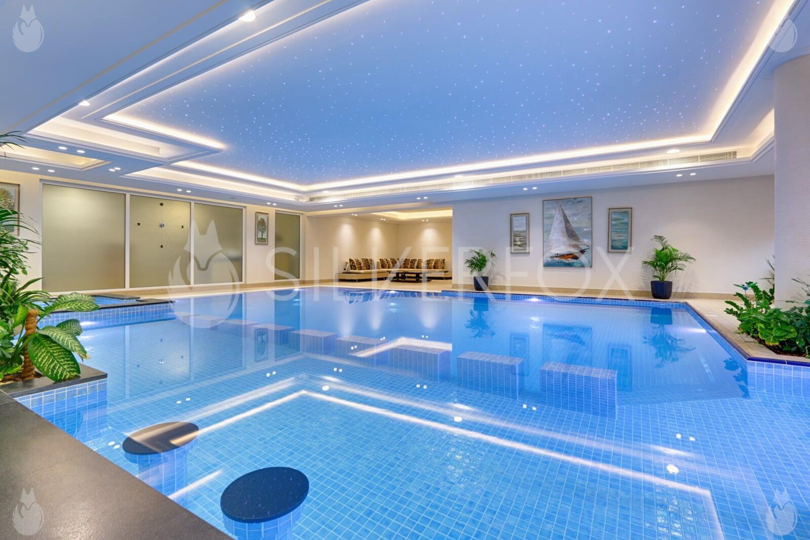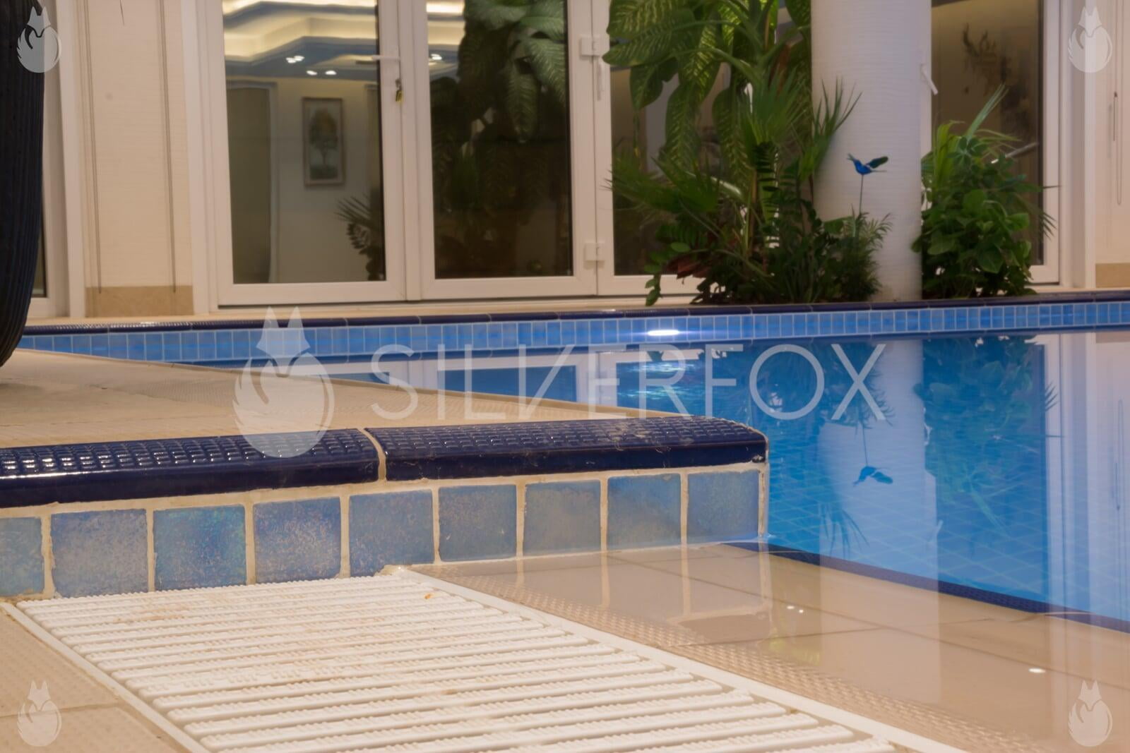 Residential Indoor Overflow Pool with Spa, Submerged Stepping Stones, Underwater Seats, Steps, & Water Feature
