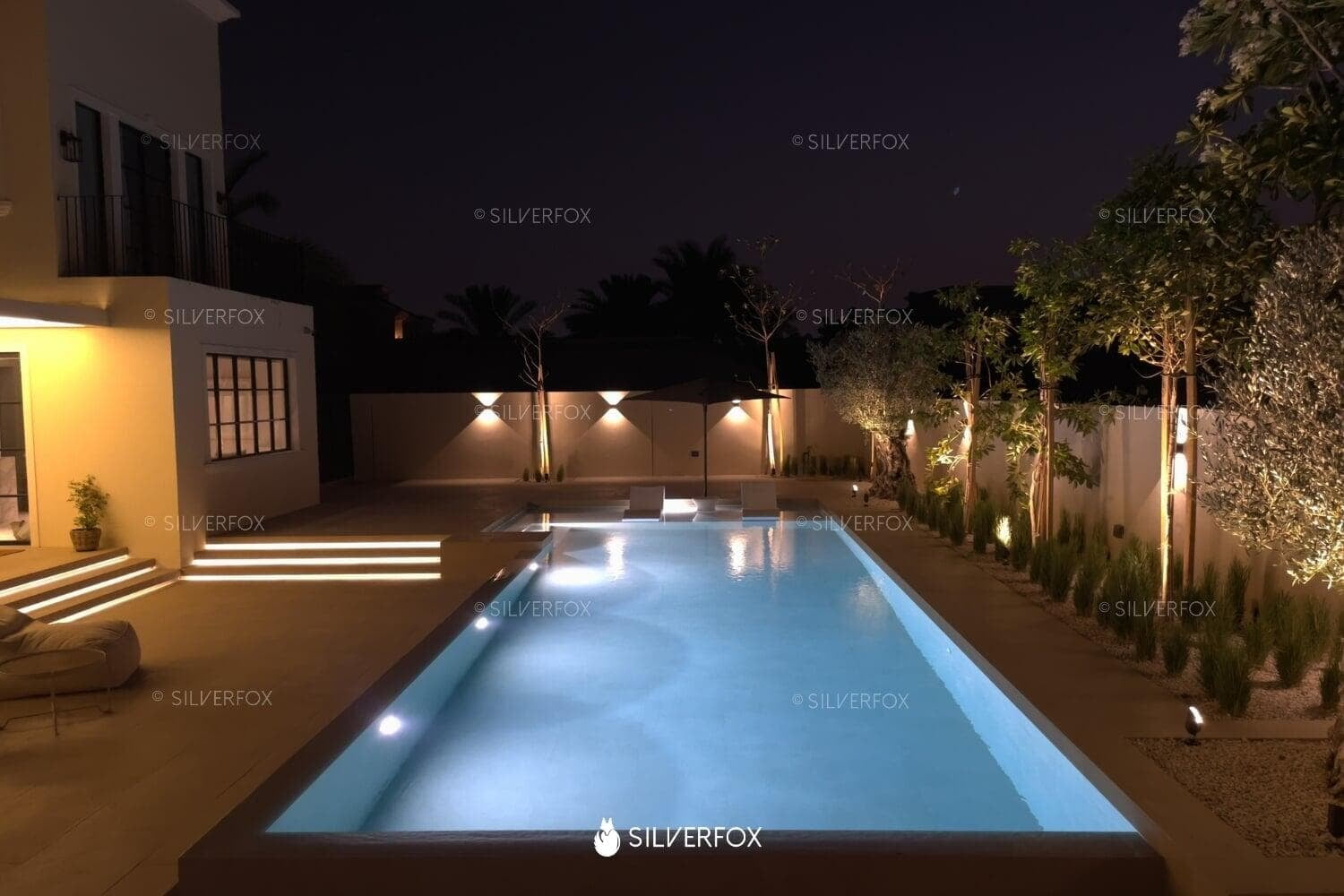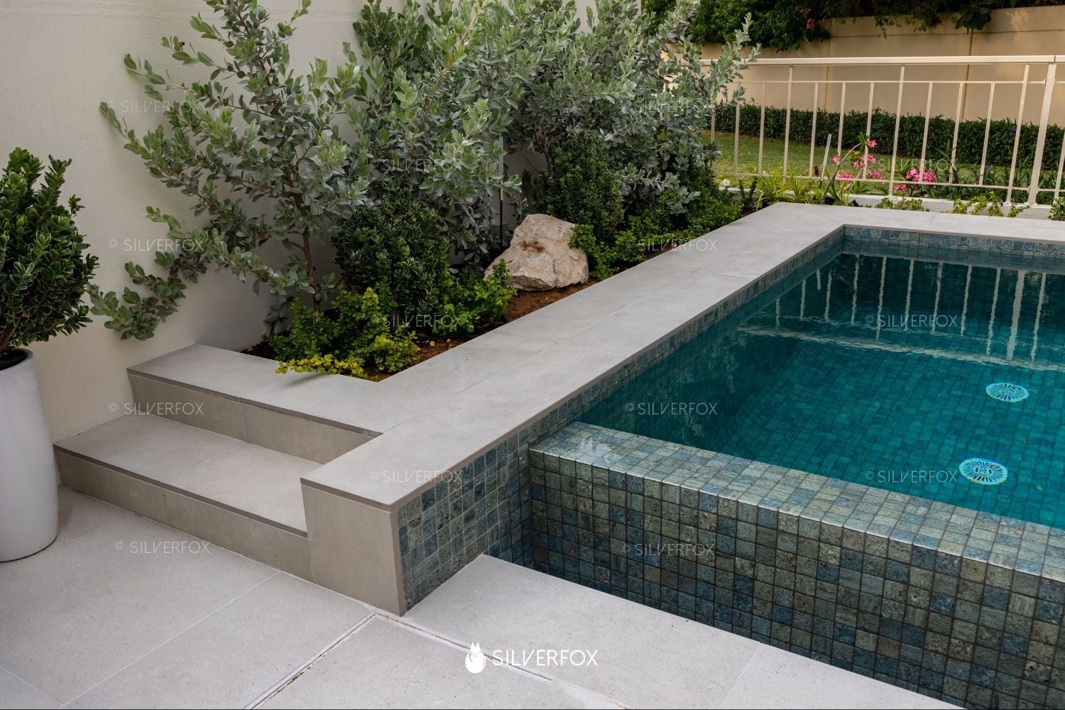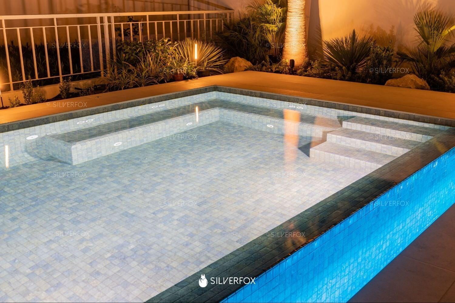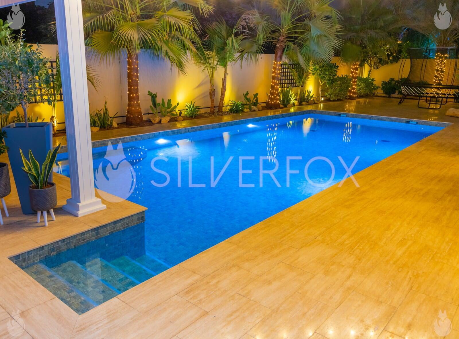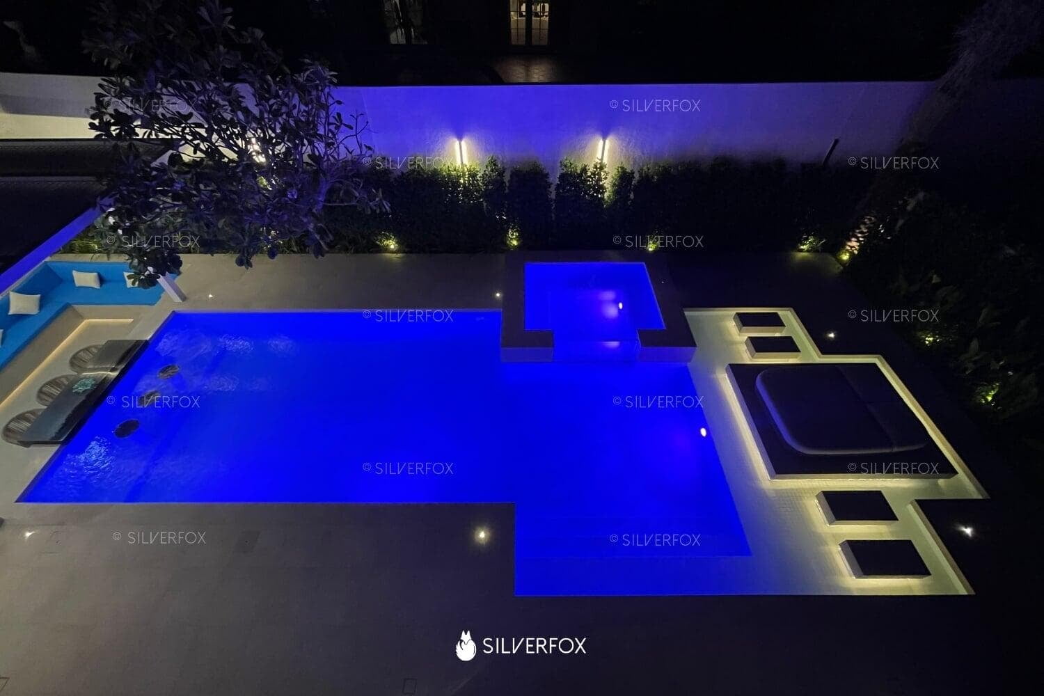 Residential Skimmer Pool with Steps, Water Feature, Decking, Outdoor Shower, Landscaping, Wooden Pump Room, & Outdoor Lighting