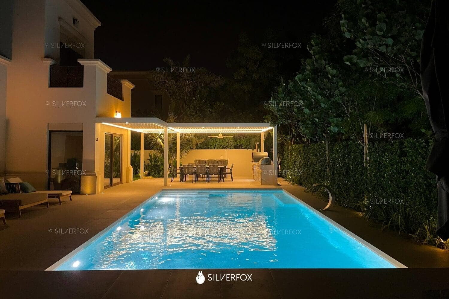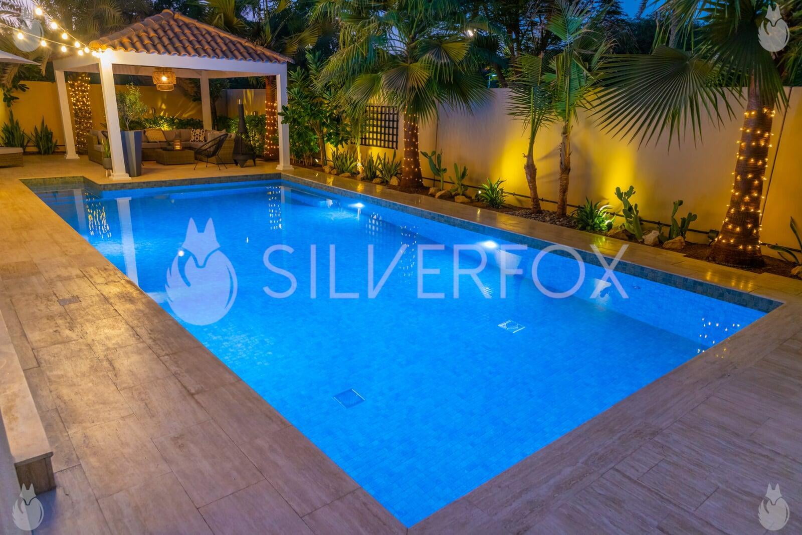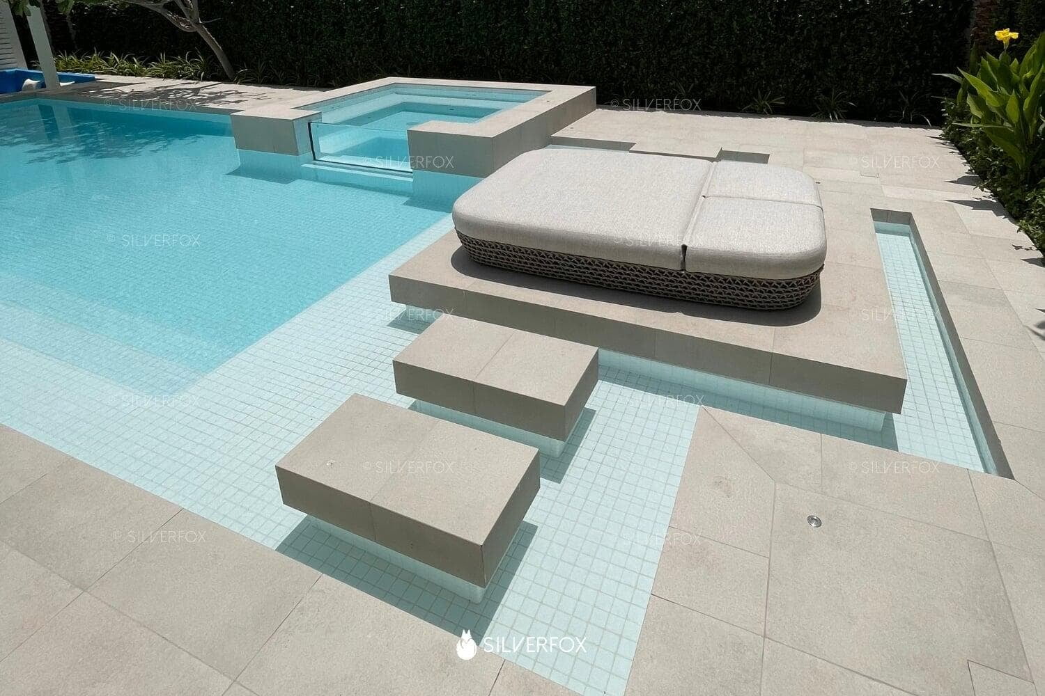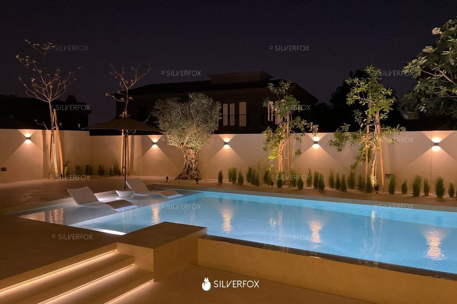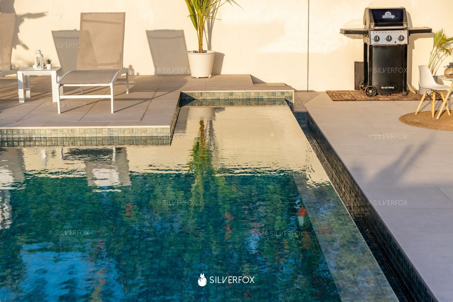 Residential Skimmer Pool with Steps, Water Feature, Decking, Outdoor Shower, Landscaping, Wooden Pump Room, & Outdoor Lighting
