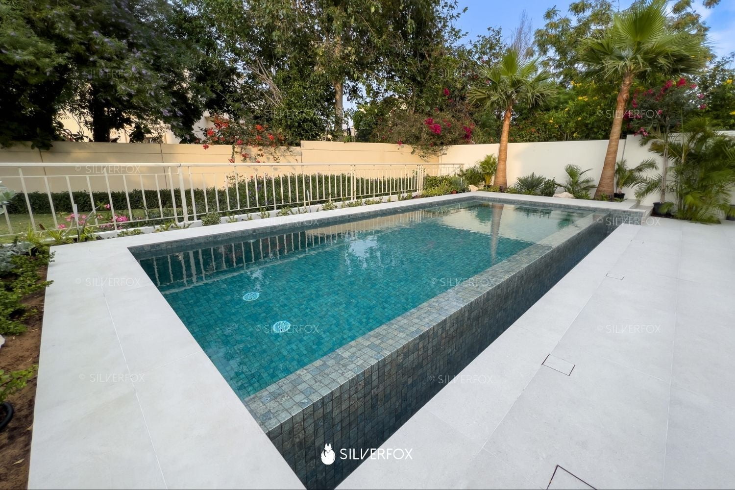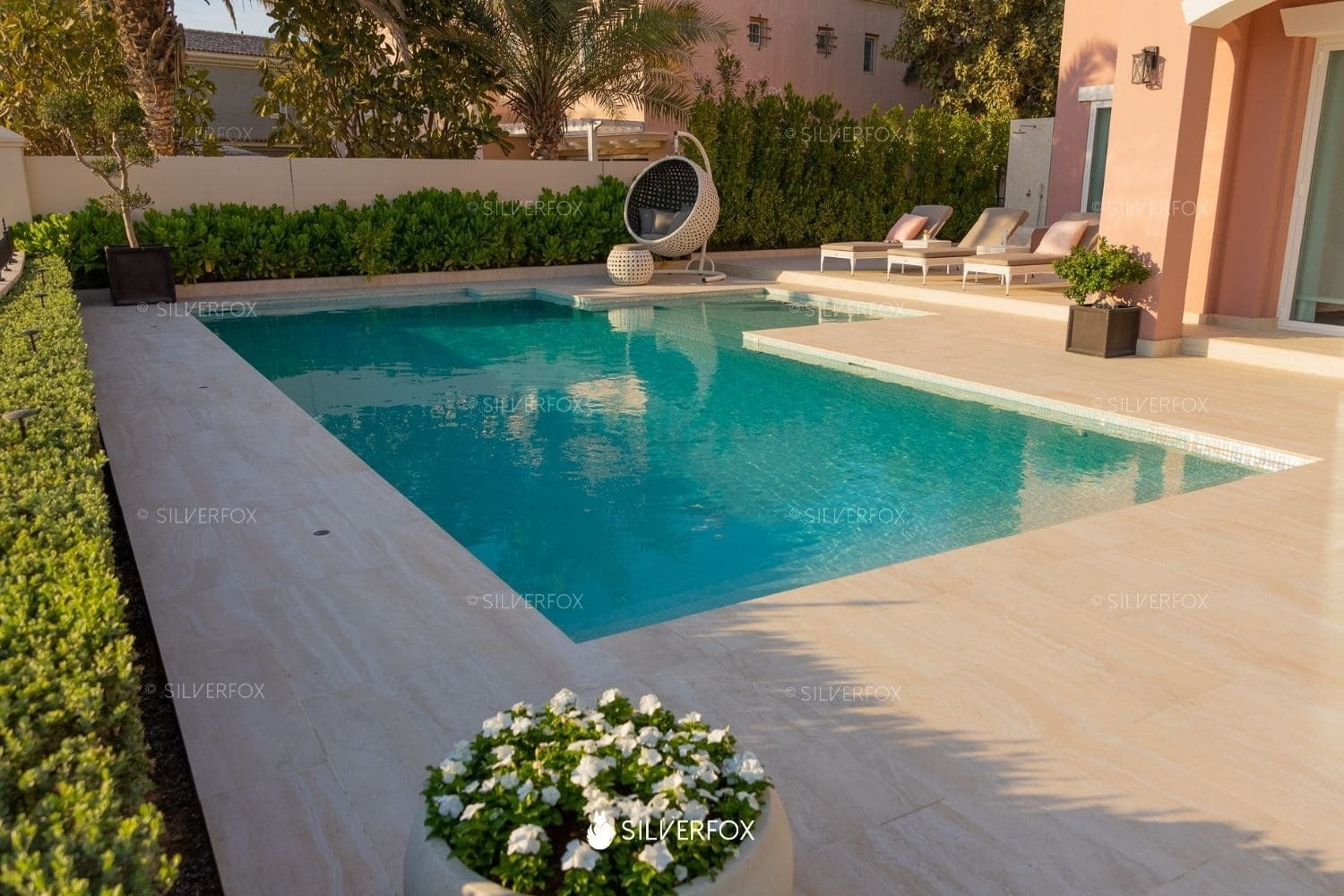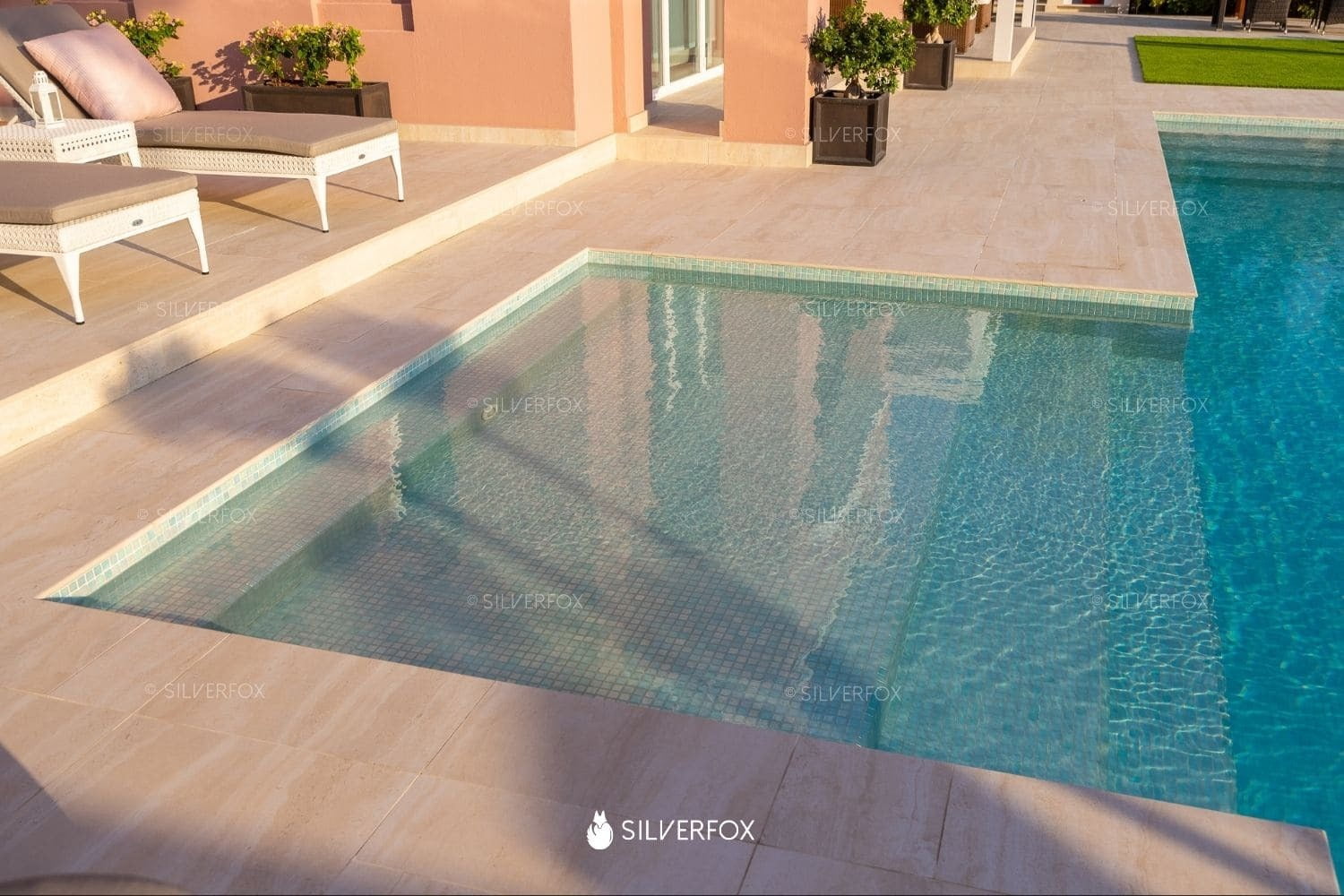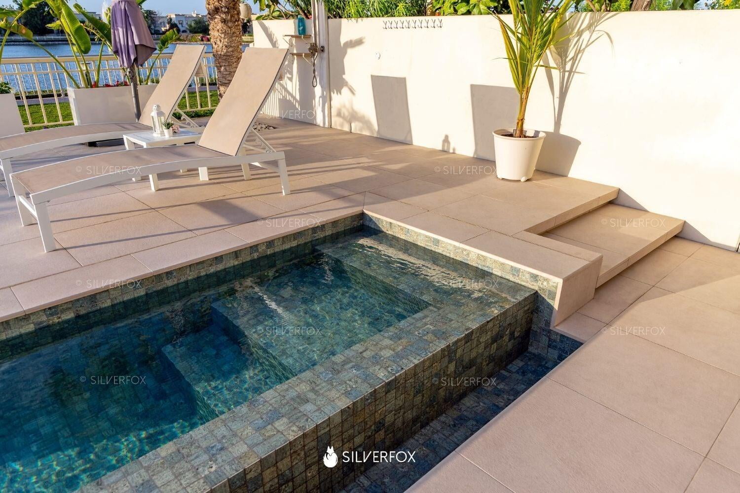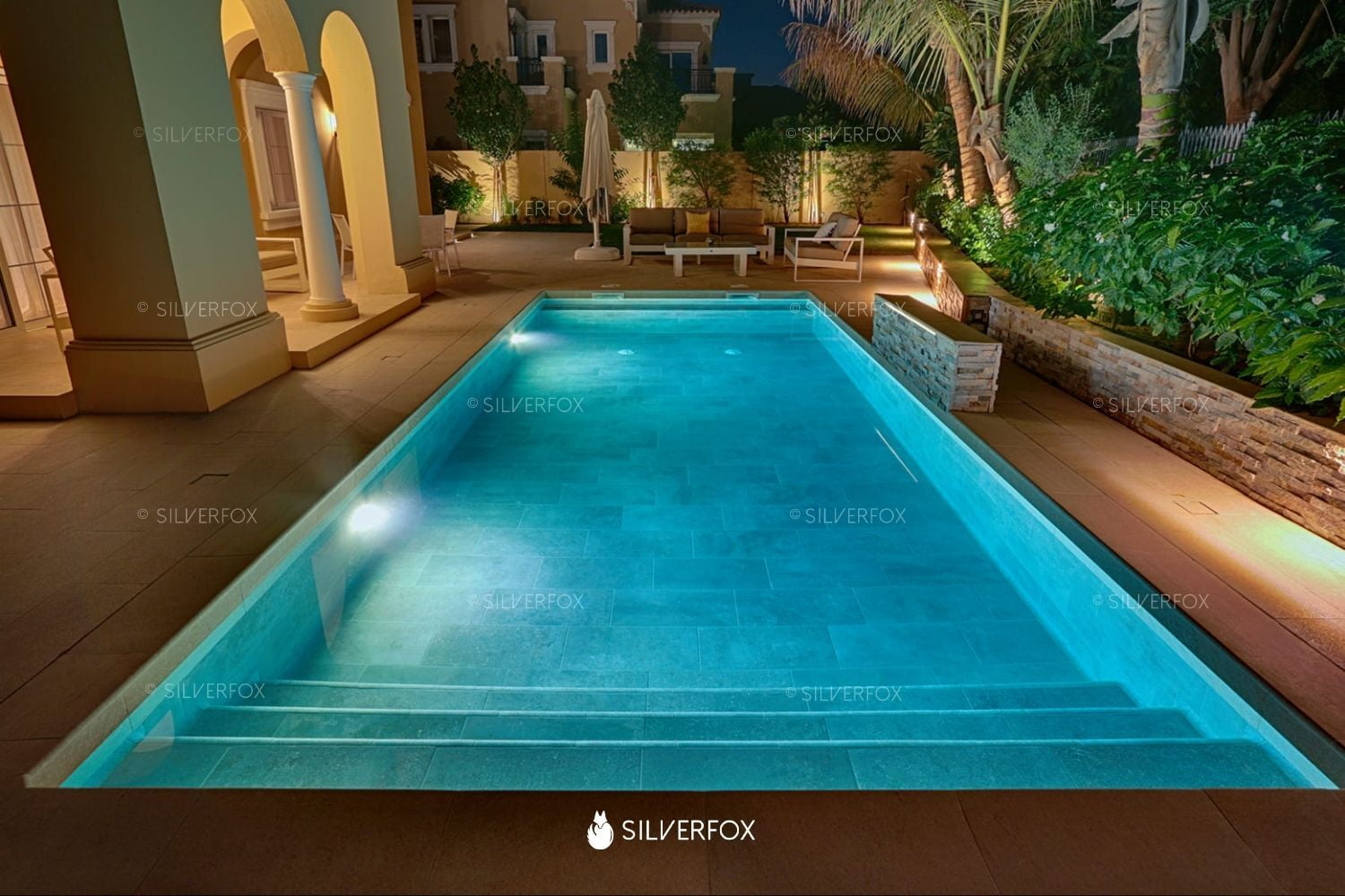 Residential Skimmer Pool with Steps, Water Feature, Decking, Outdoor Shower, Landscaping, Wooden Pump Room, & Outdoor Lighting