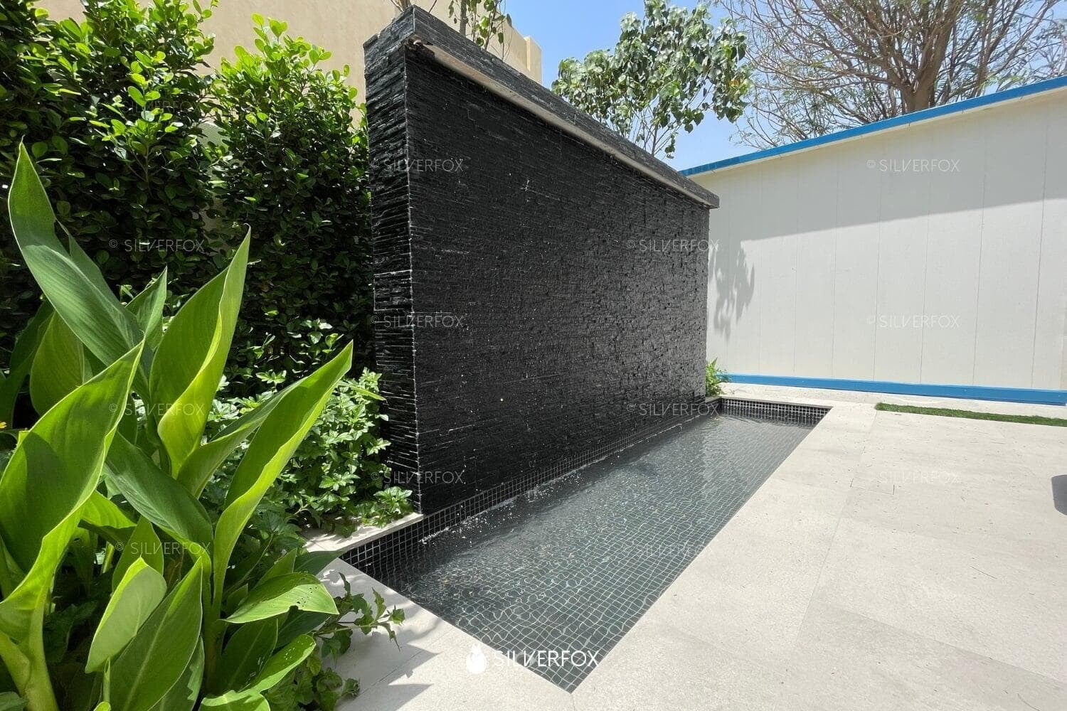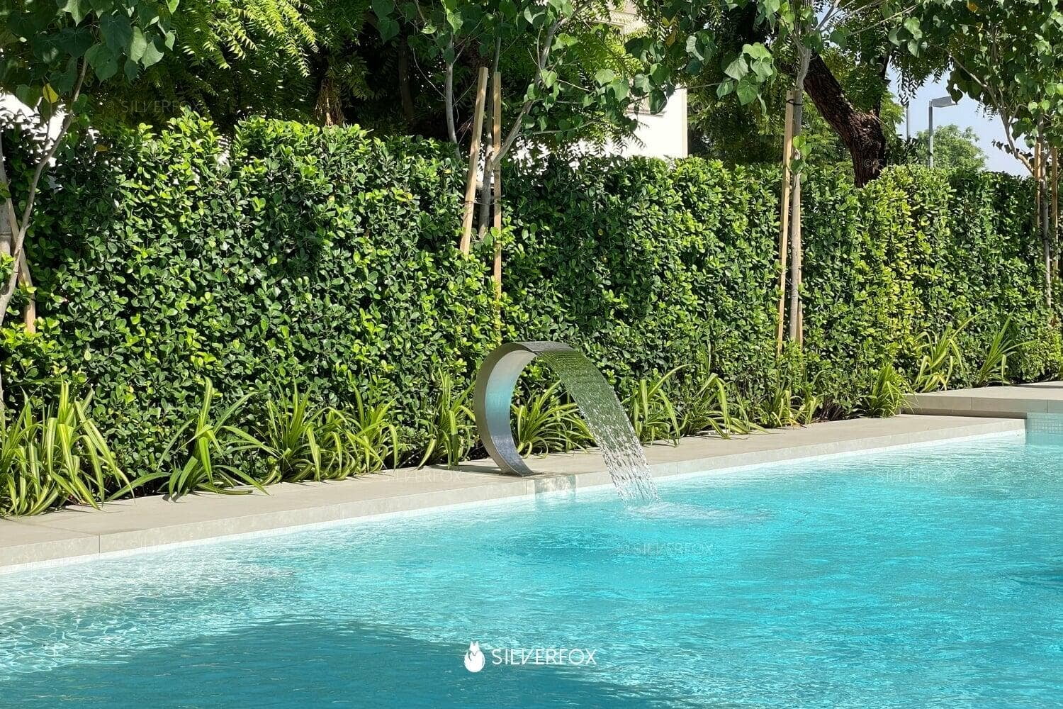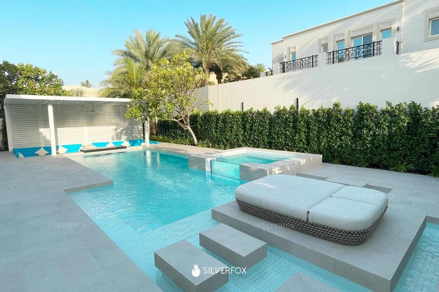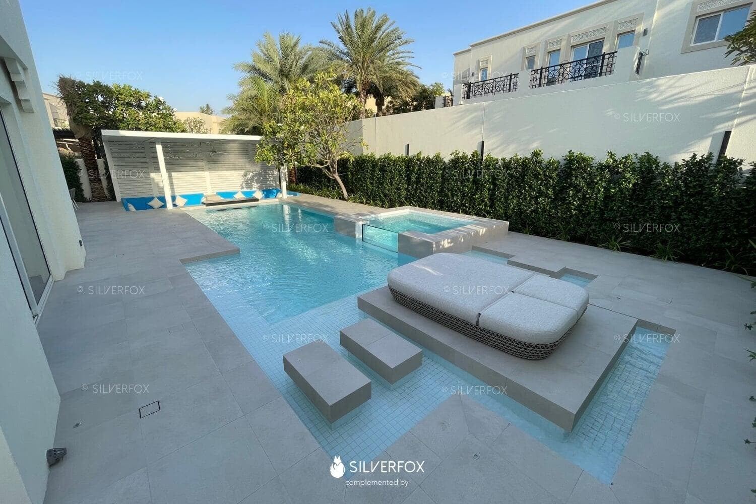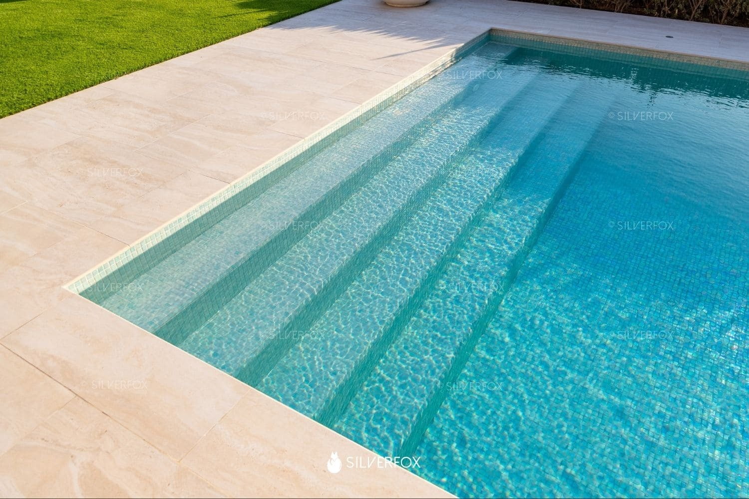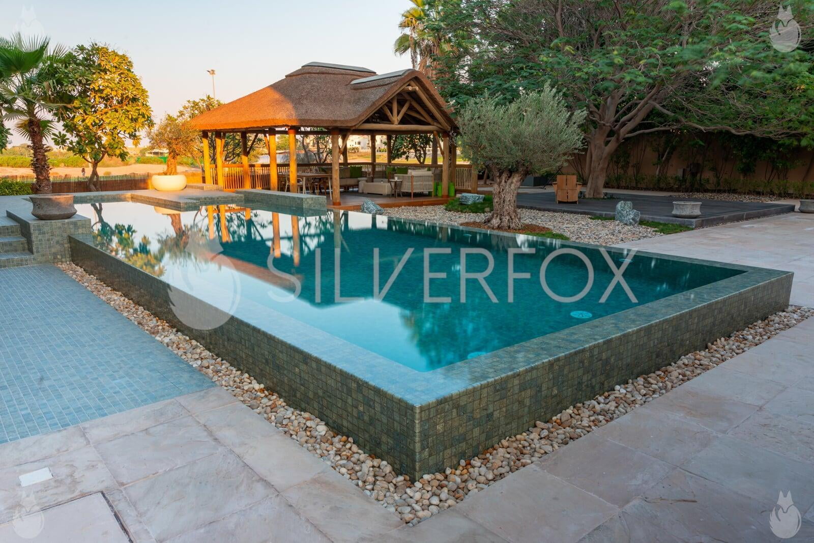 Residential Skimmer Pool with Steps, Water Feature, Decking, Outdoor Shower, Landscaping, Wooden Pump Room, & Outdoor Lighting