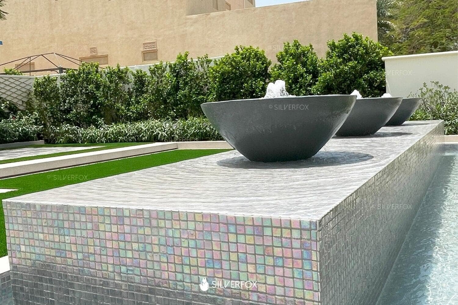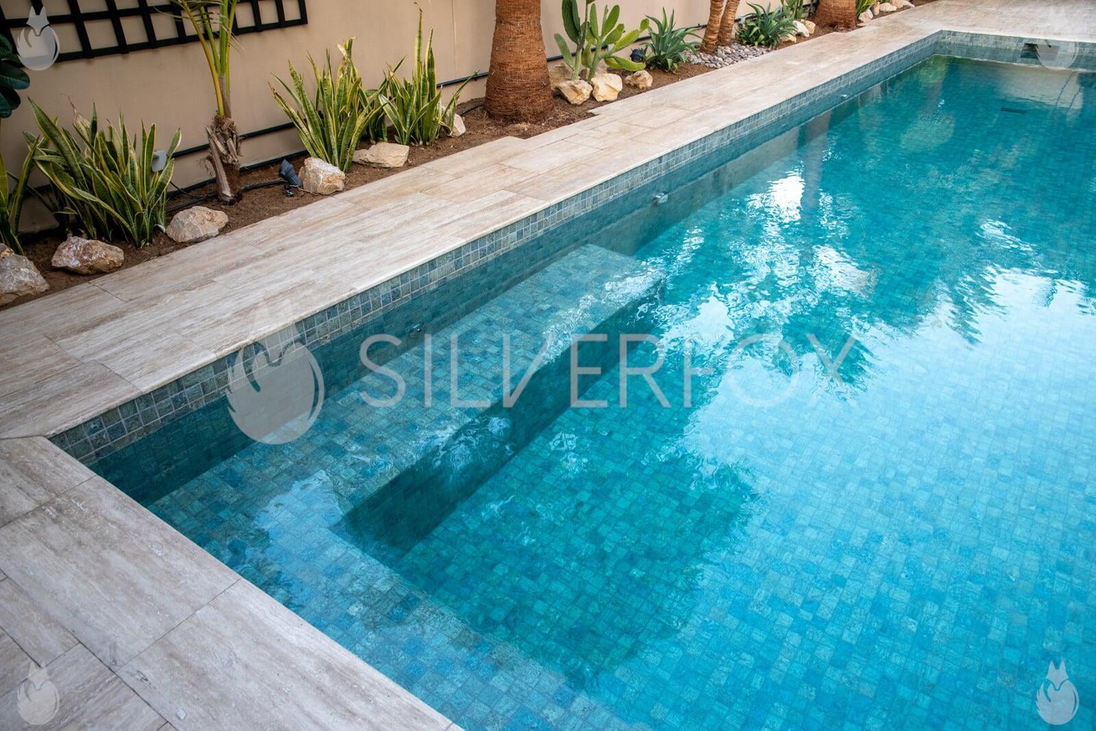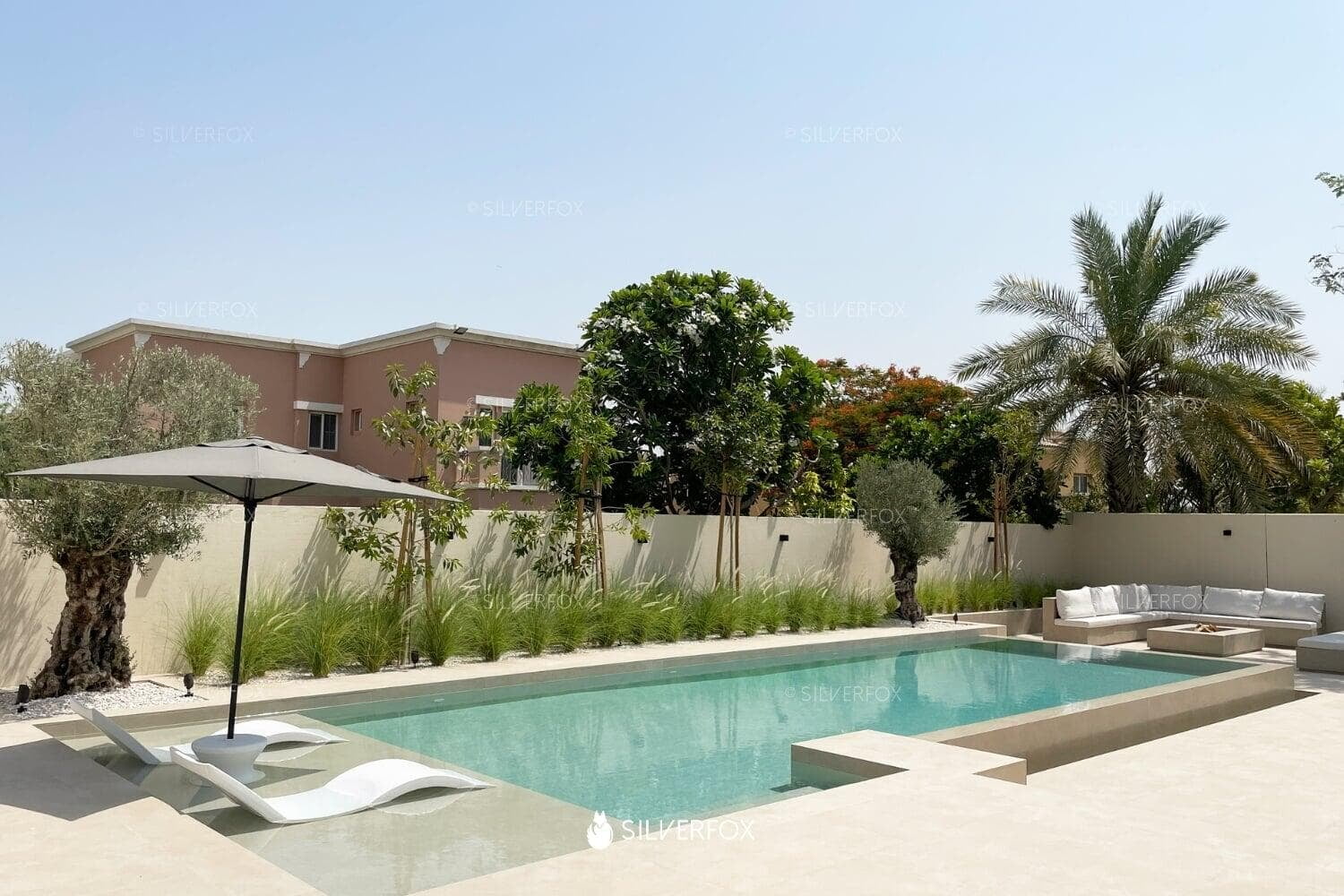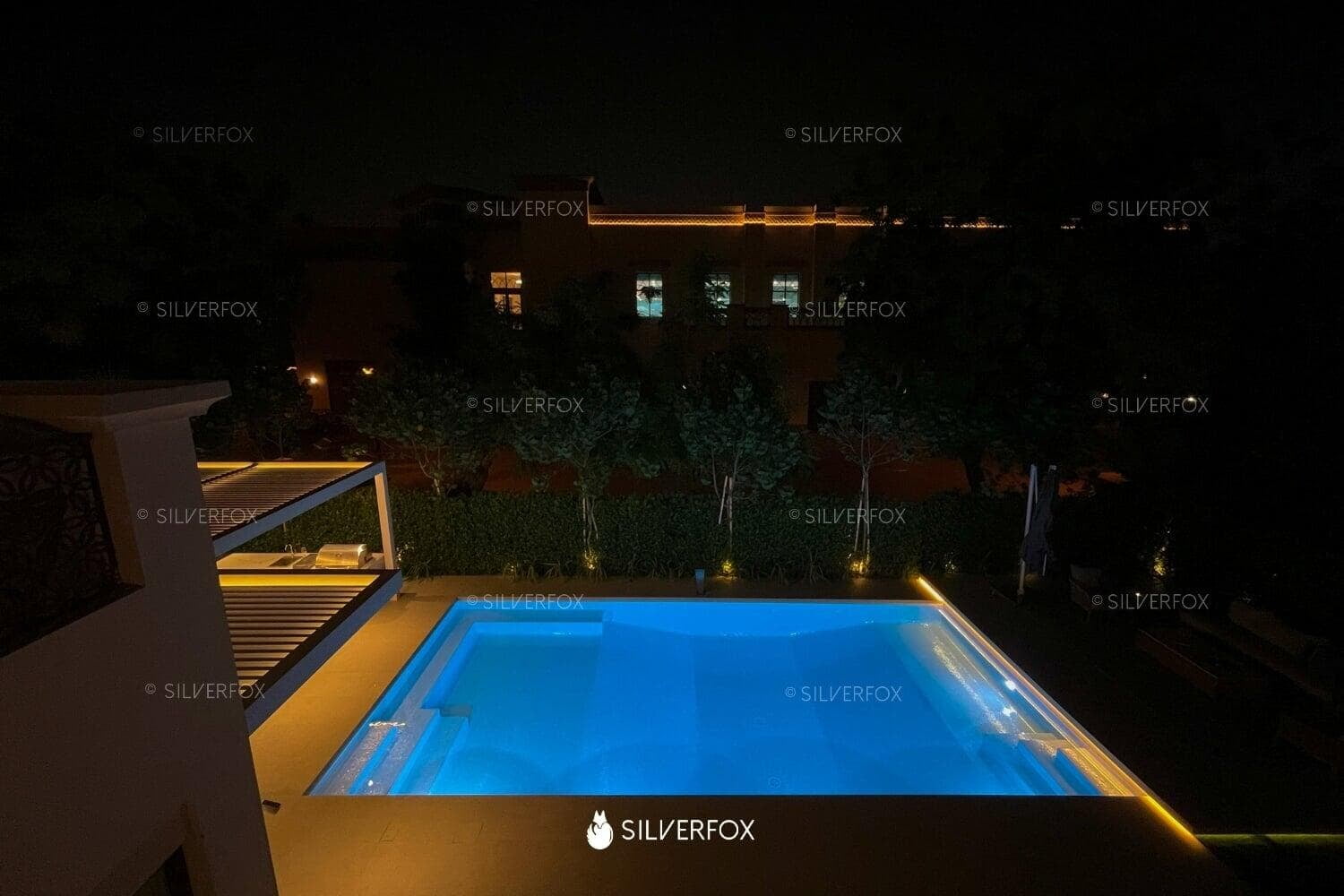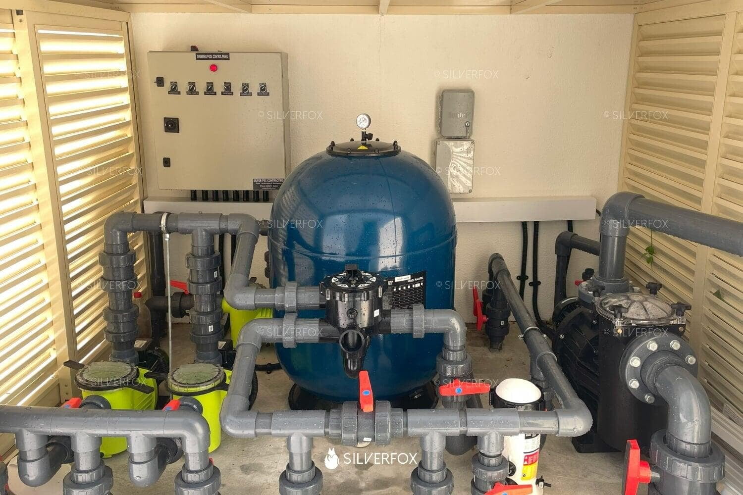 Residential Skimmer Pool with Steps, Water Feature, Decking, Outdoor Shower, Landscaping, Wooden Pump Room, & Outdoor Lighting
