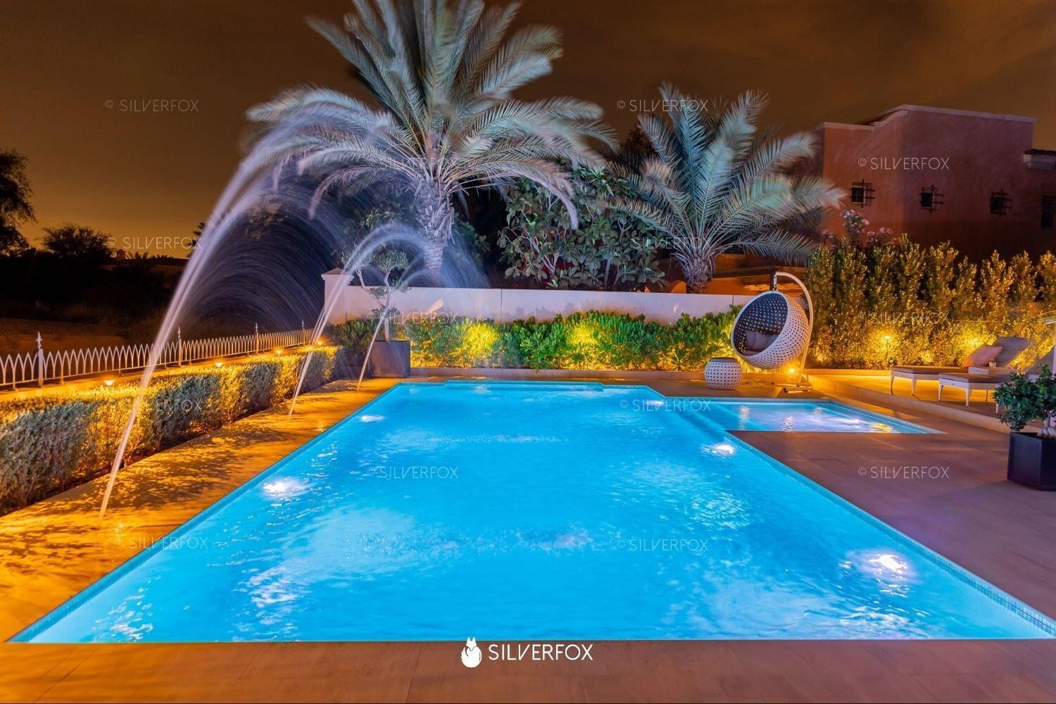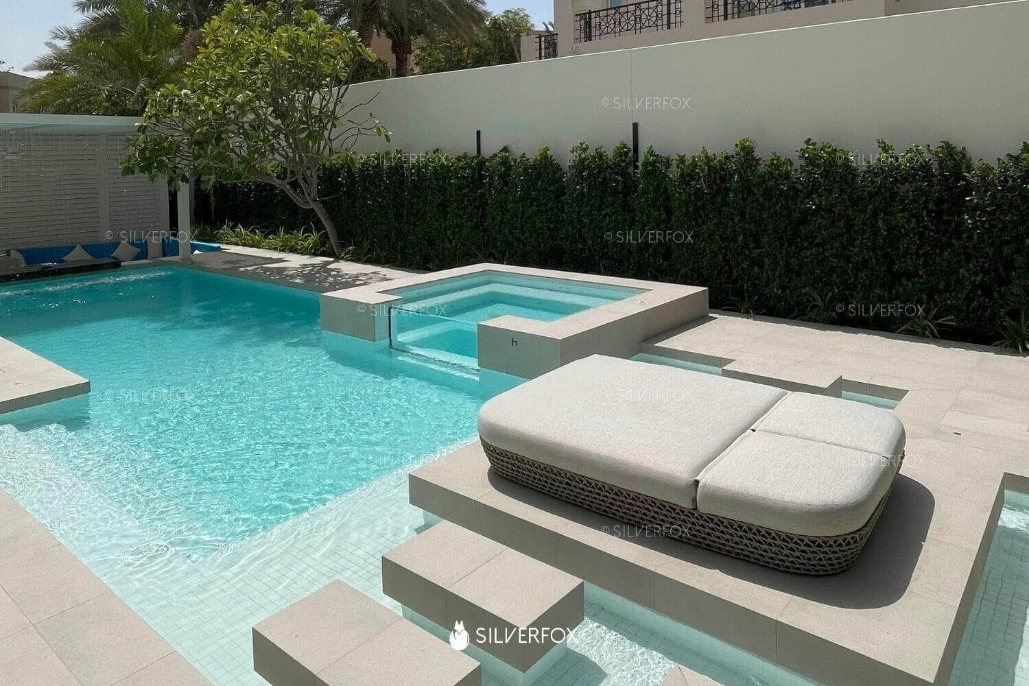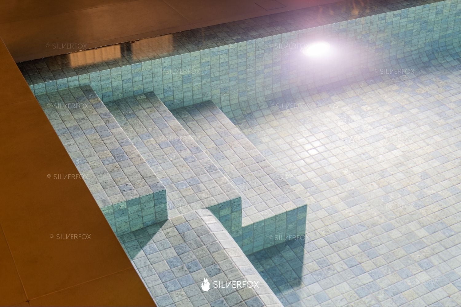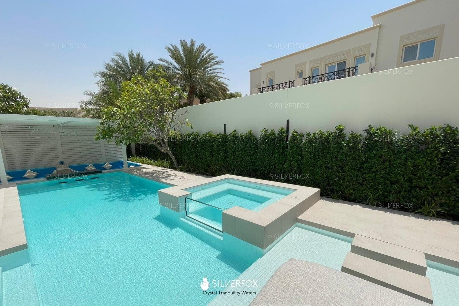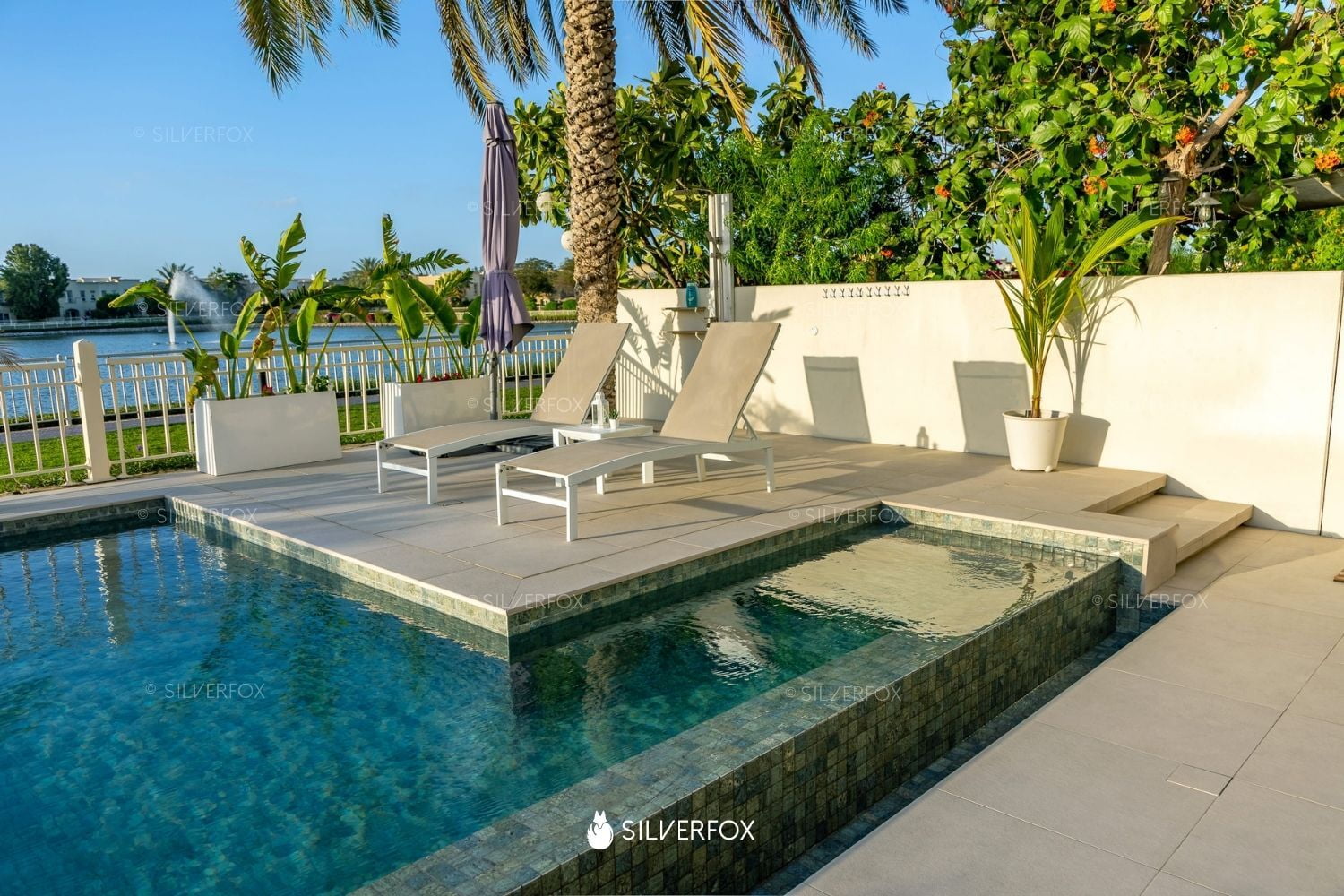 Residential Skimmer Pool with Steps, Water Feature, Decking, Outdoor Shower, Landscaping, Wooden Pump Room, & Outdoor Lighting
