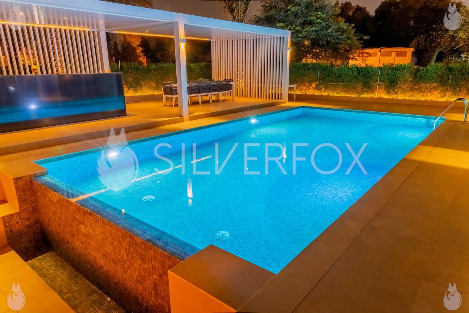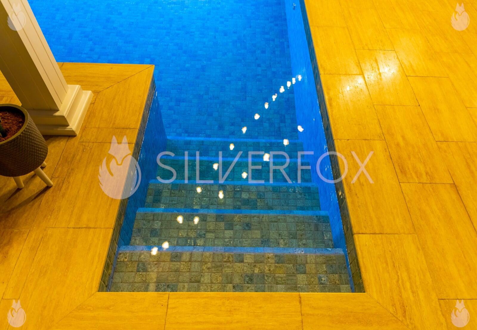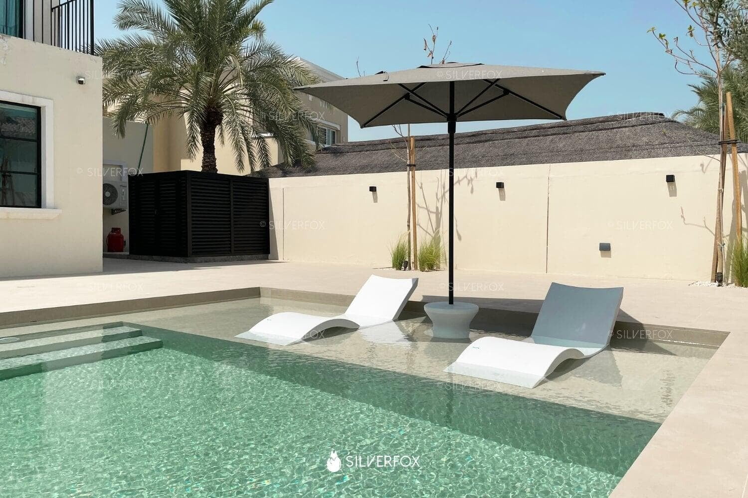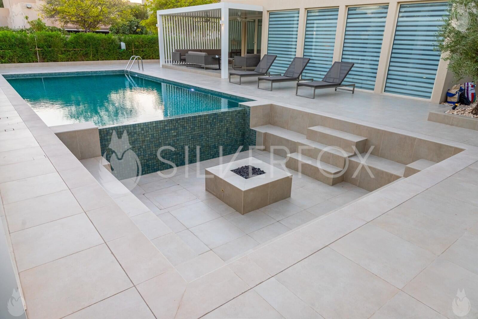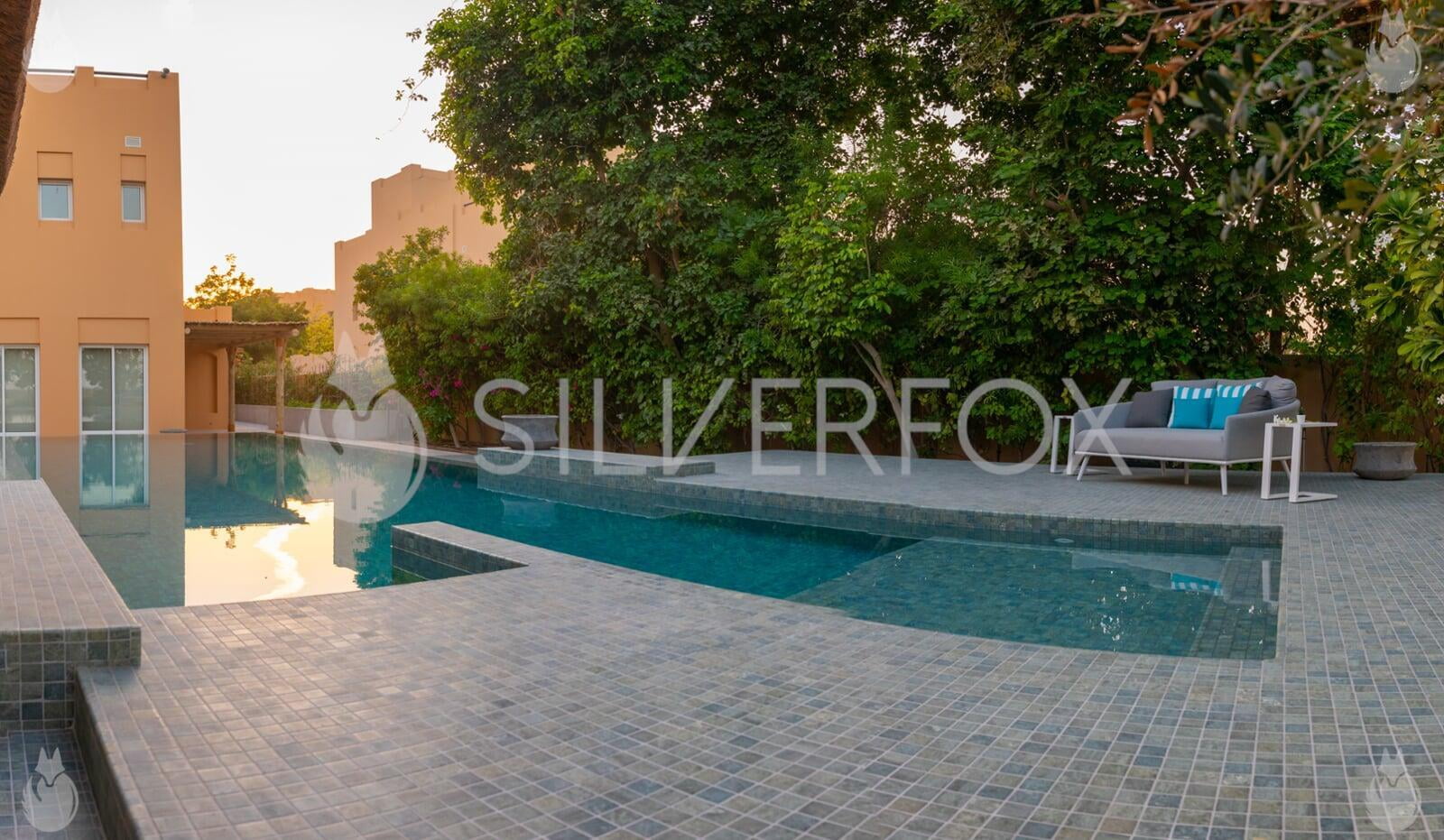 Residential Skimmer Pool with Steps, Water Feature, Decking, Outdoor Shower, Landscaping, Wooden Pump Room, & Outdoor Lighting