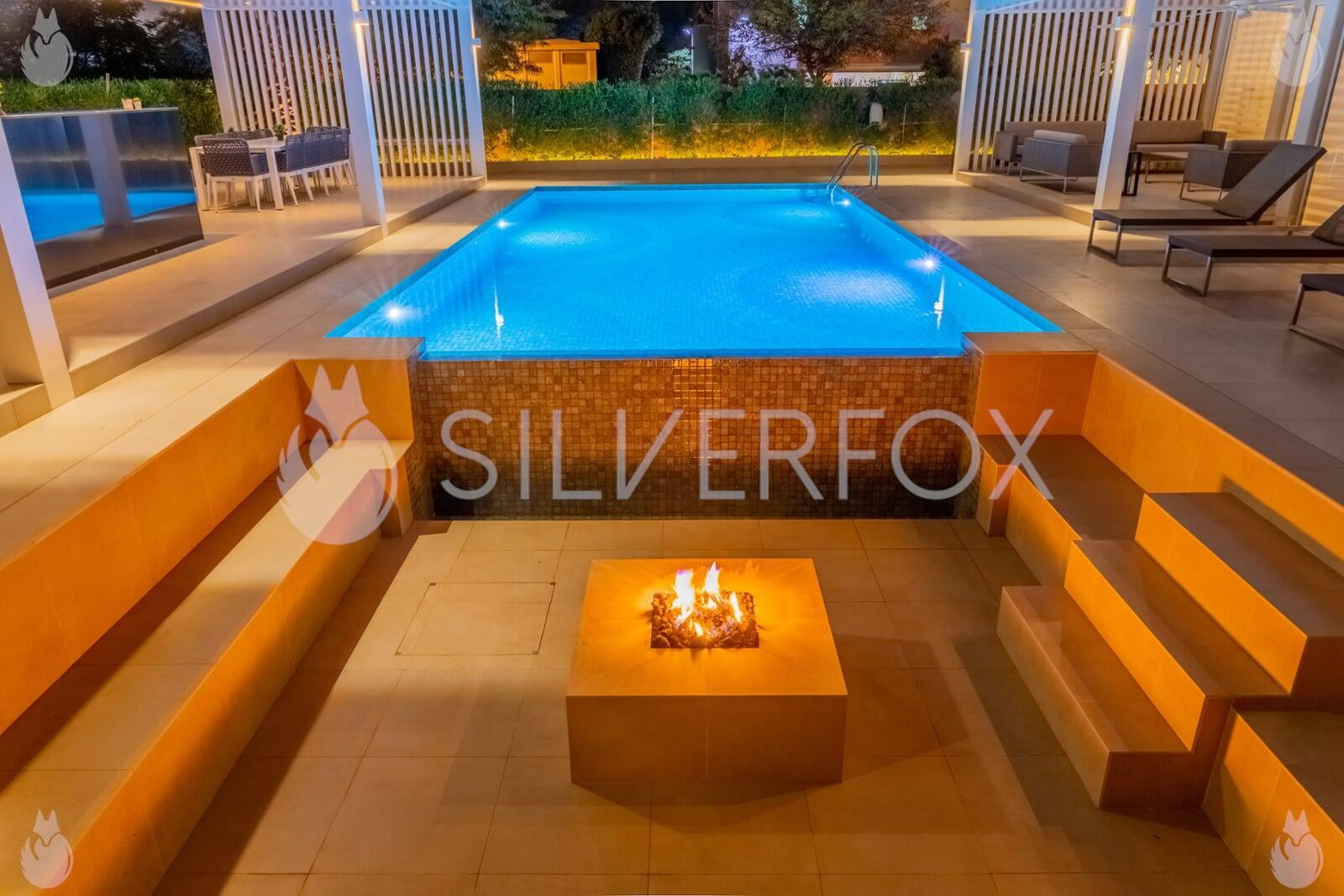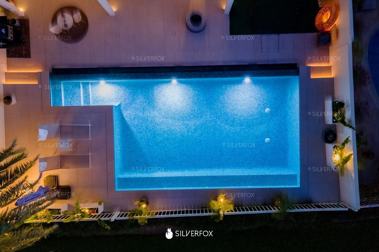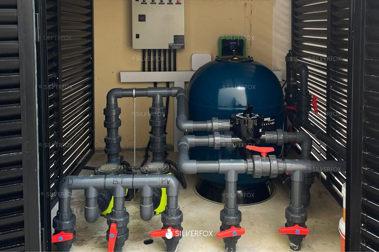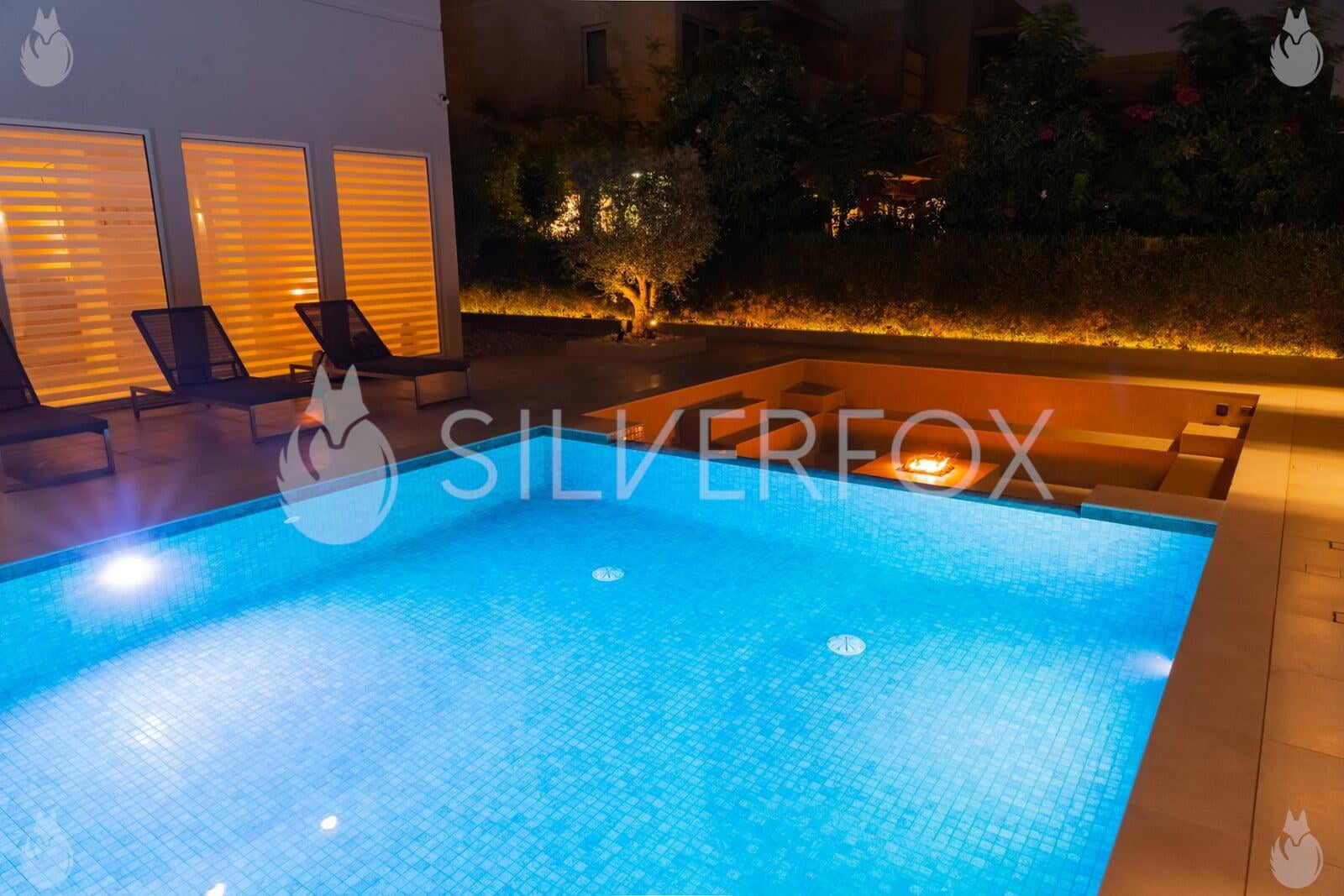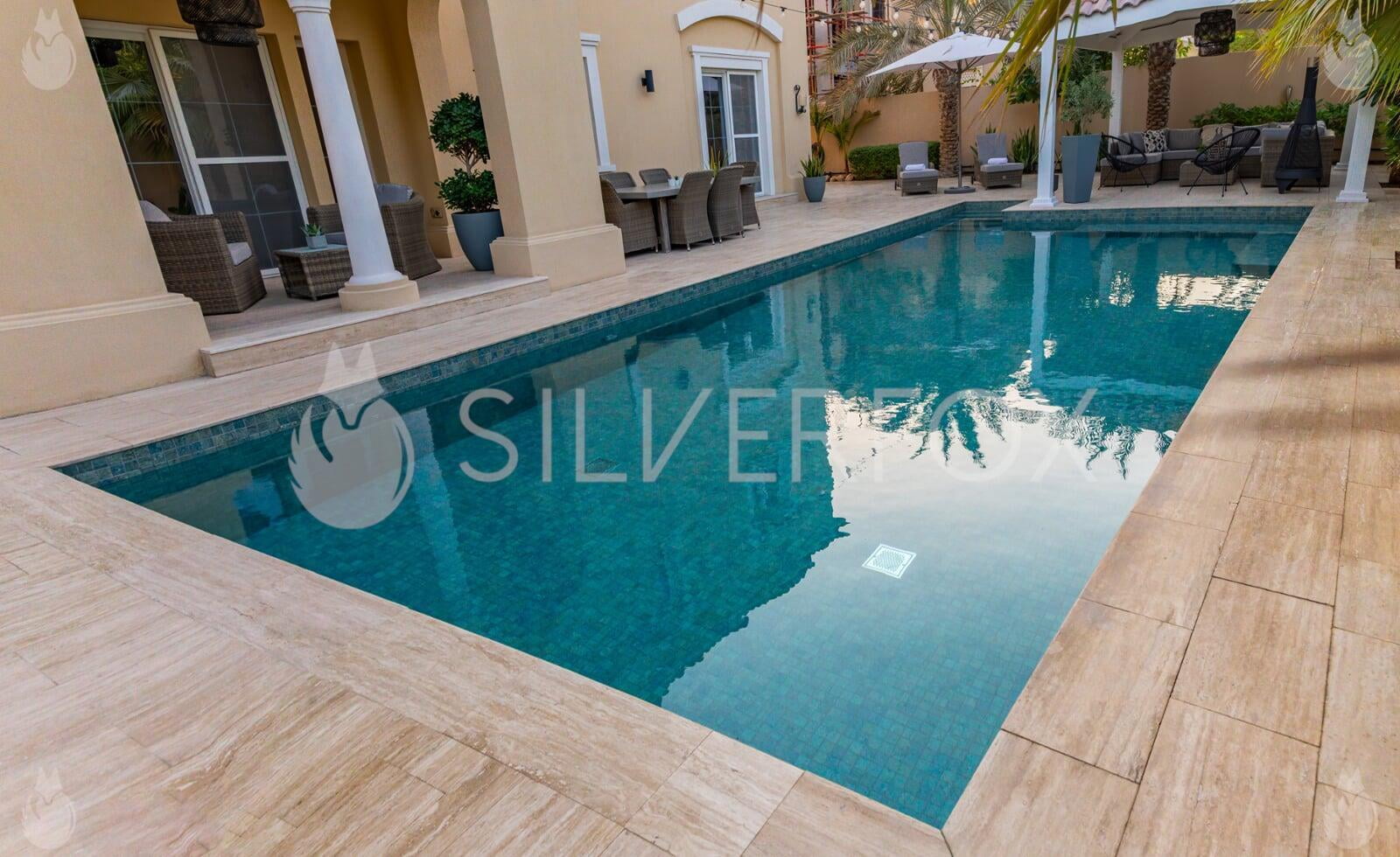 Residential Skimmer Pool with Steps, Water Feature, Decking, Outdoor Shower, Landscaping, Wooden Pump Room, & Outdoor Lighting