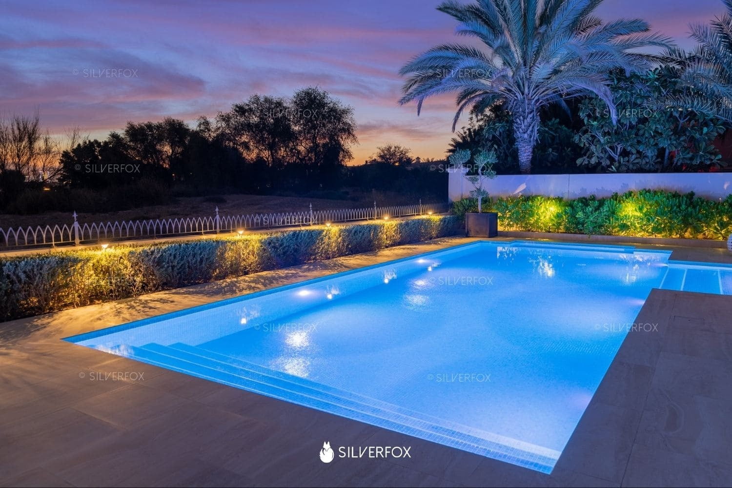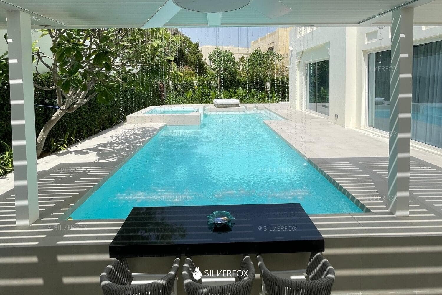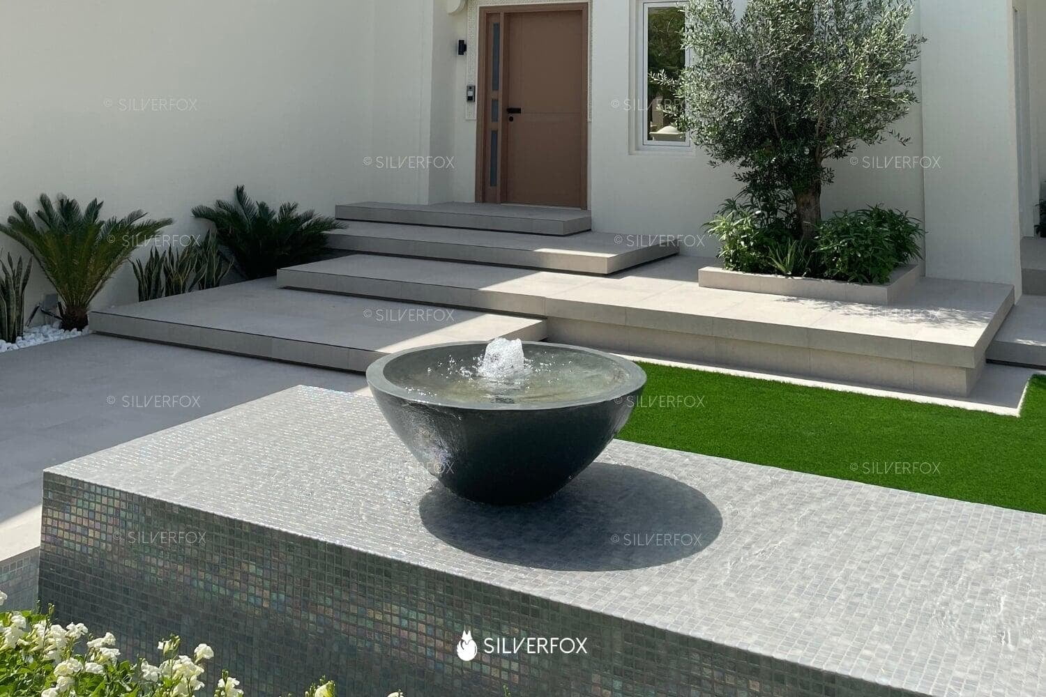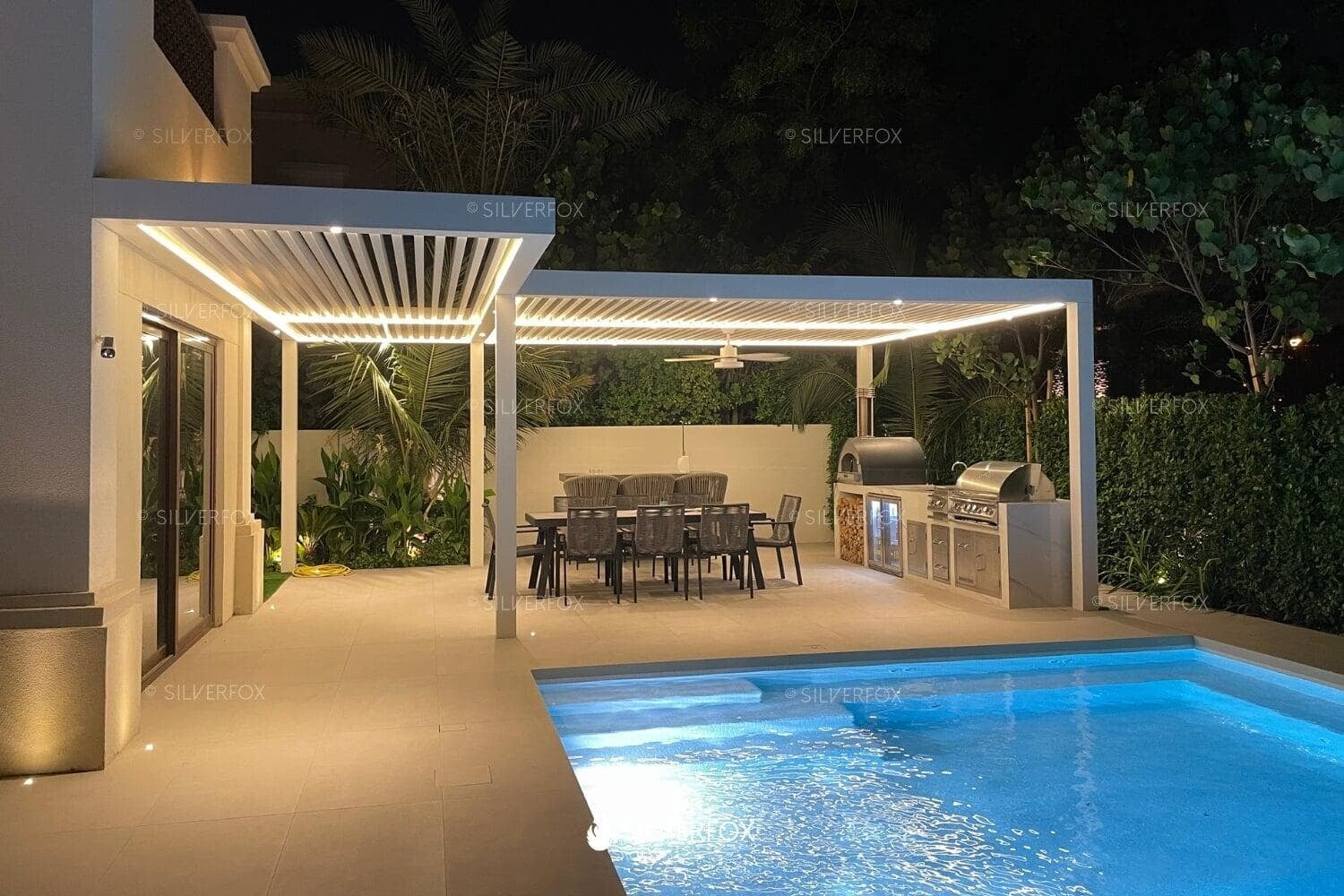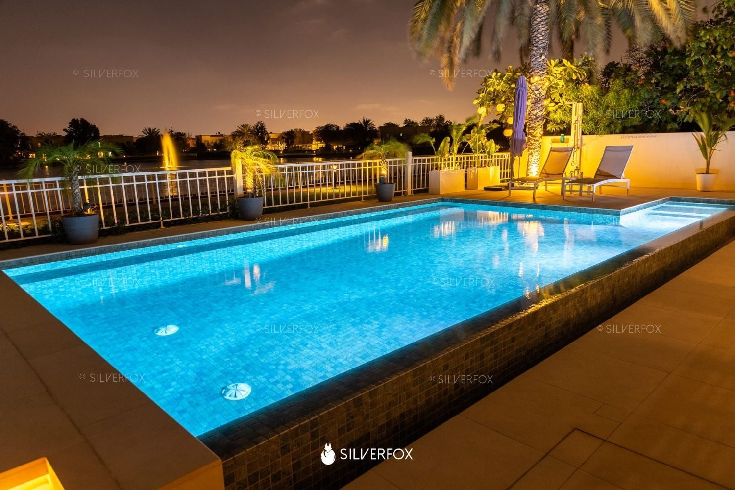 Residential Skimmer Pool with Steps, Water Feature, Decking, Outdoor Shower, Landscaping, Wooden Pump Room, & Outdoor Lighting