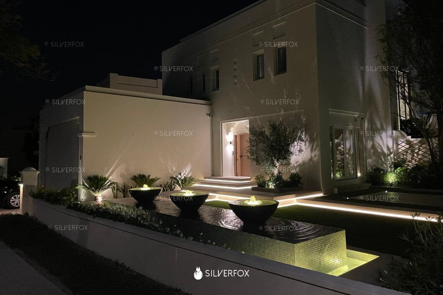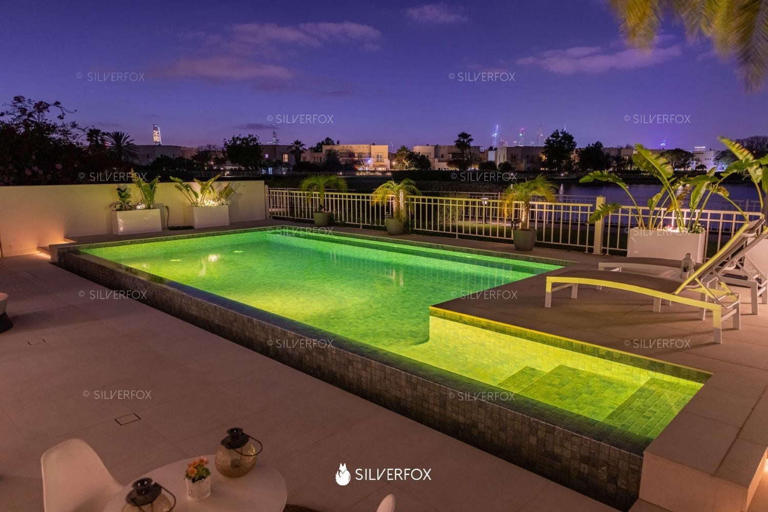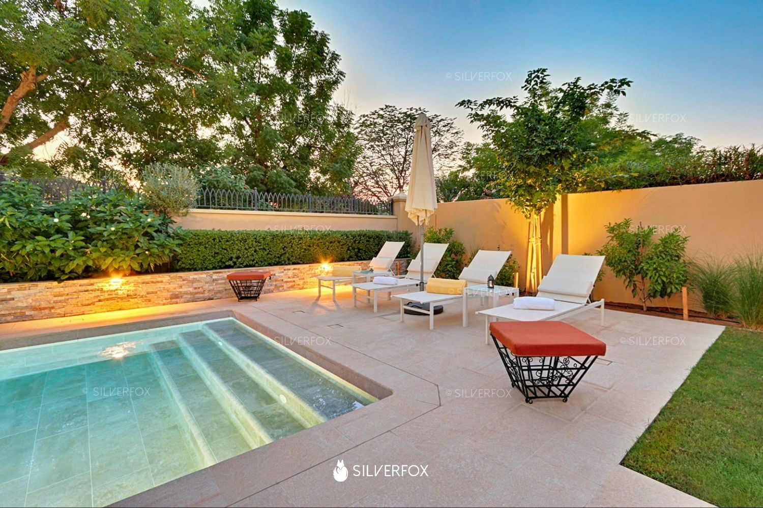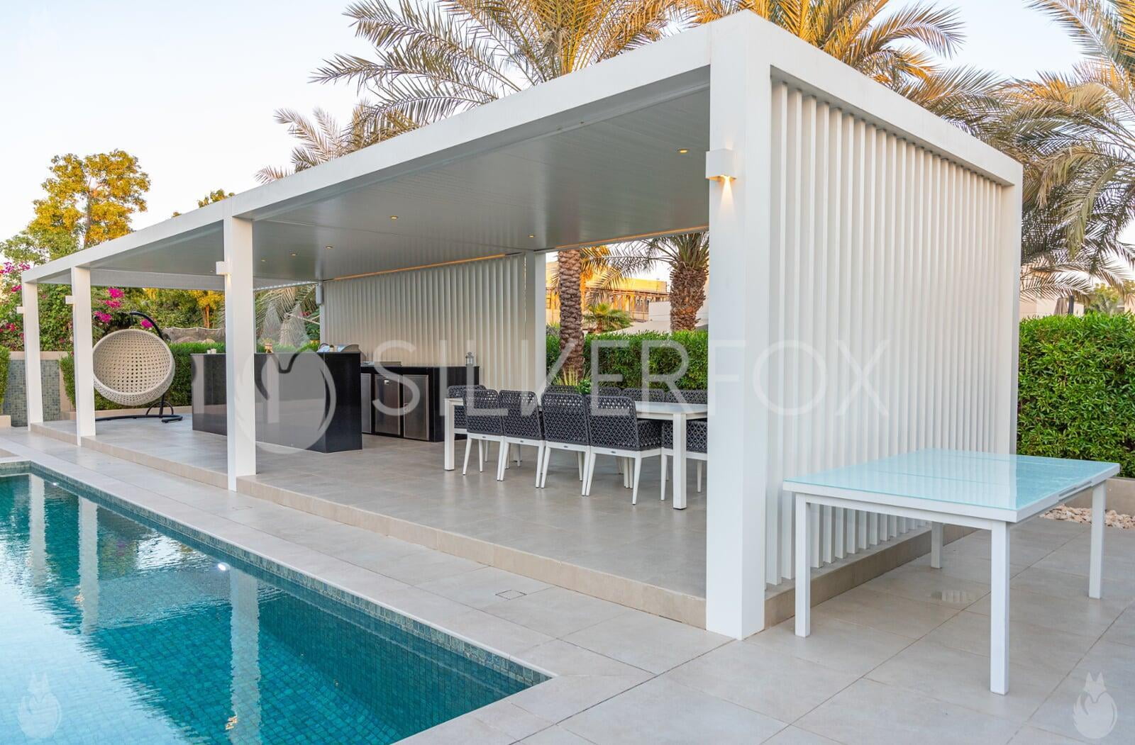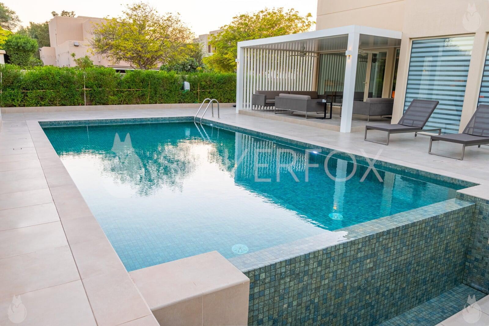 Residential Skimmer Pool with Steps, Water Feature, Decking, Outdoor Shower, Landscaping, Wooden Pump Room, & Outdoor Lighting