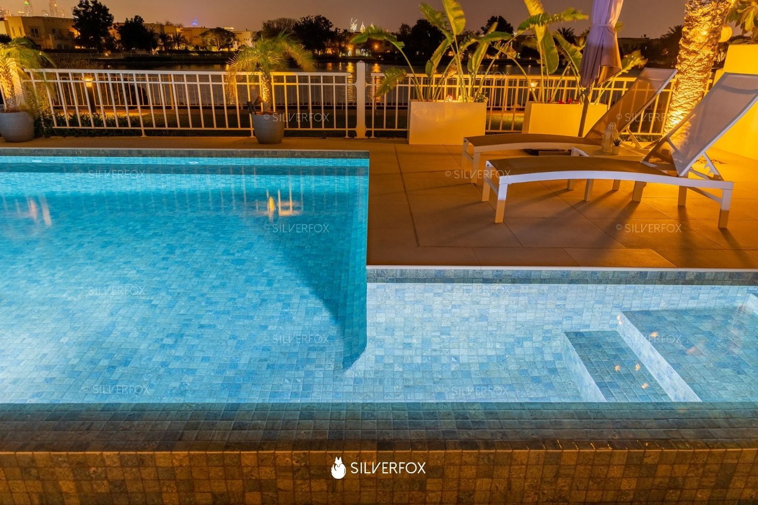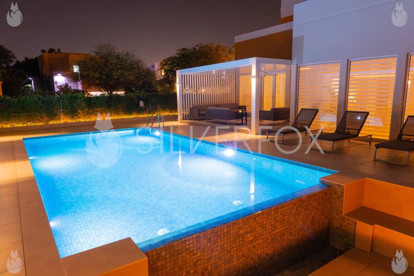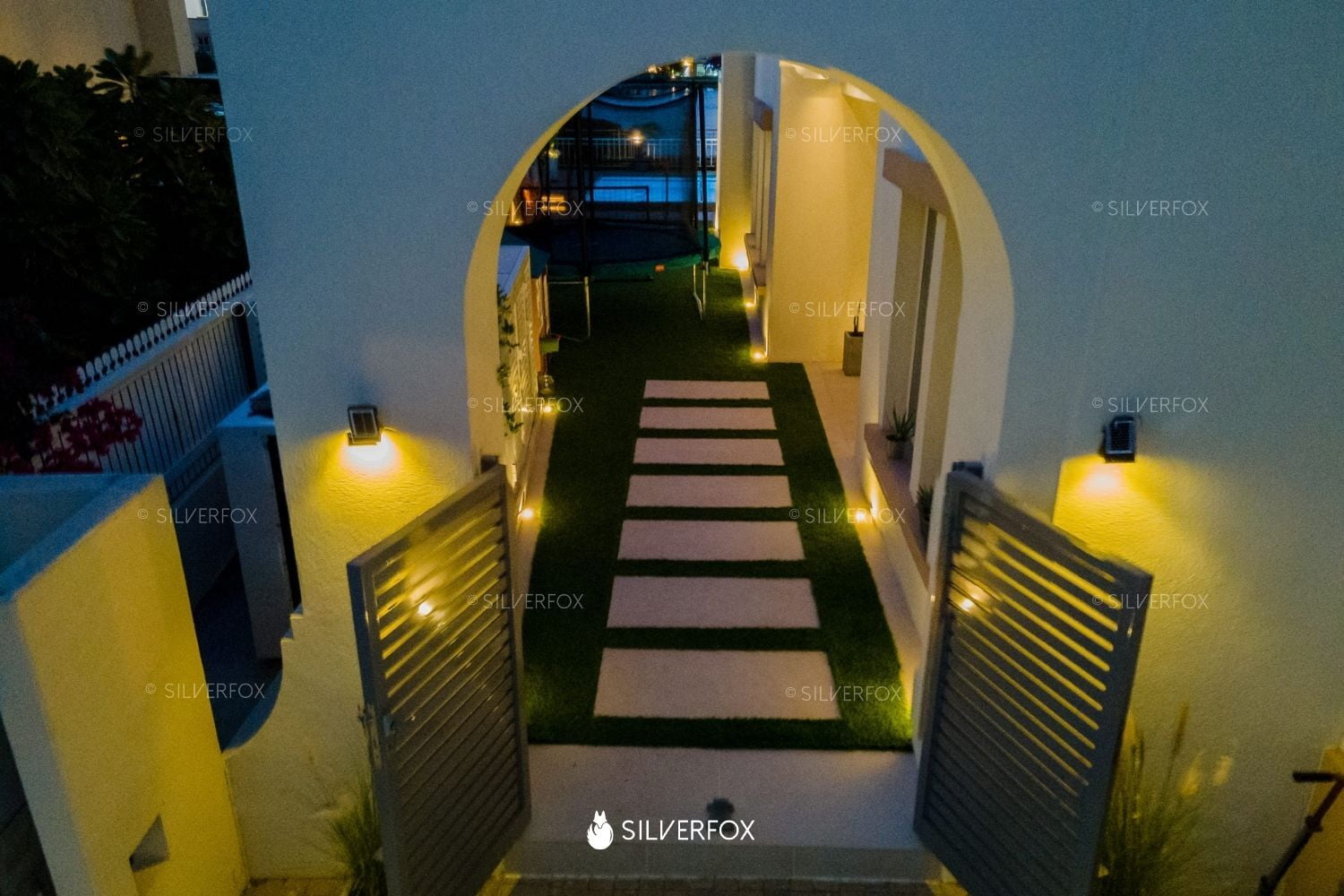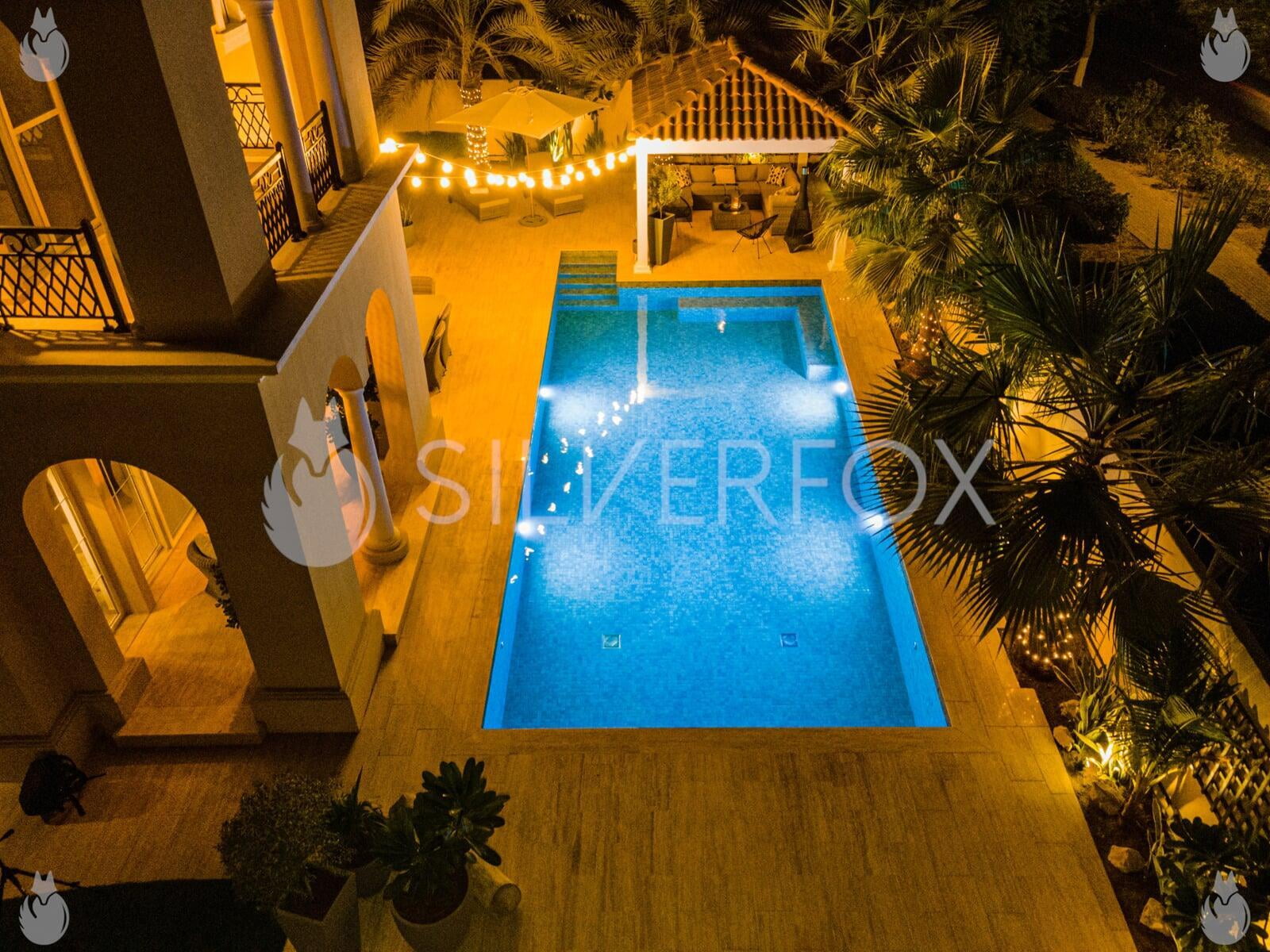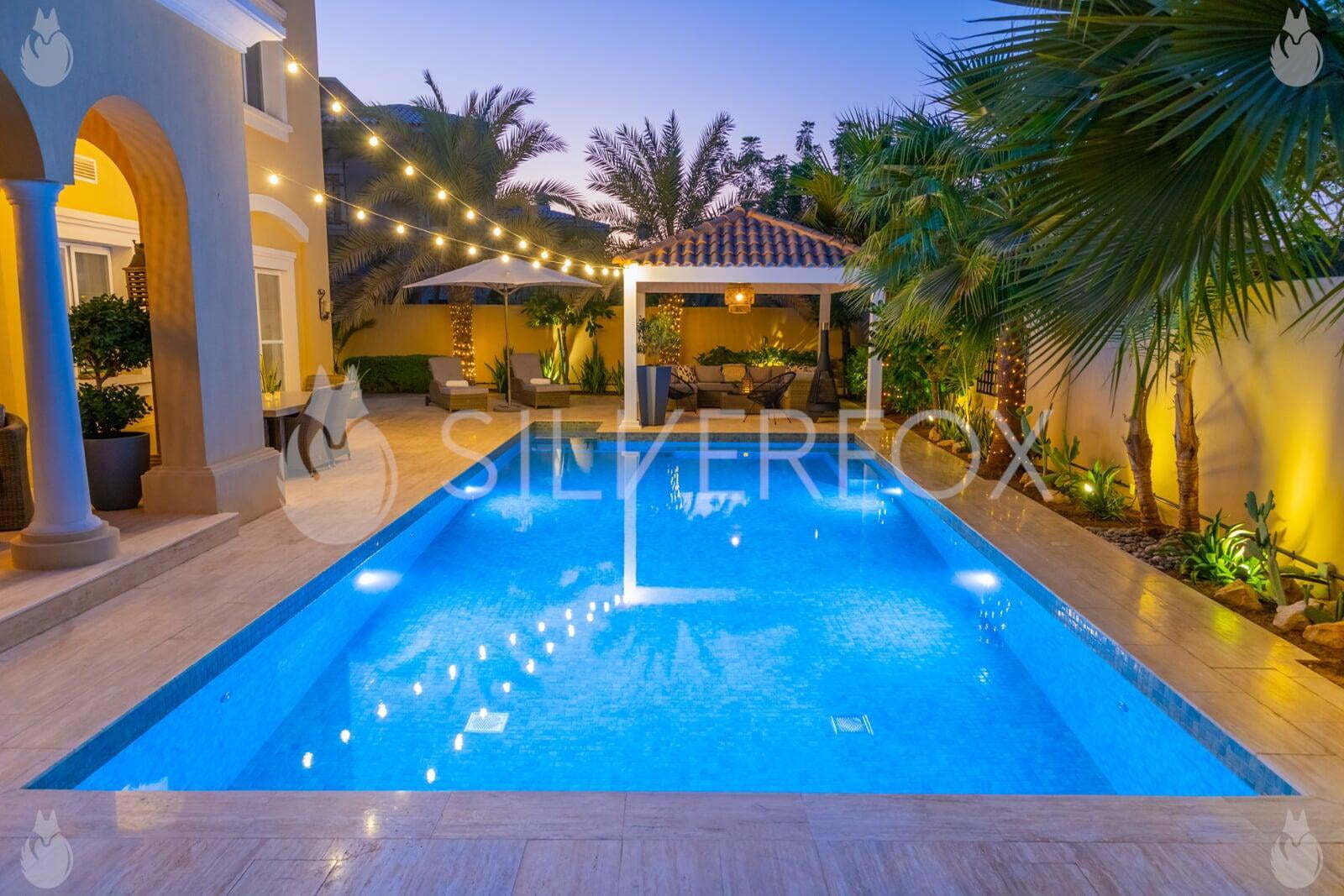 Residential Skimmer Pool with Steps, Water Feature, Decking, Outdoor Shower, Landscaping, Wooden Pump Room, & Outdoor Lighting
