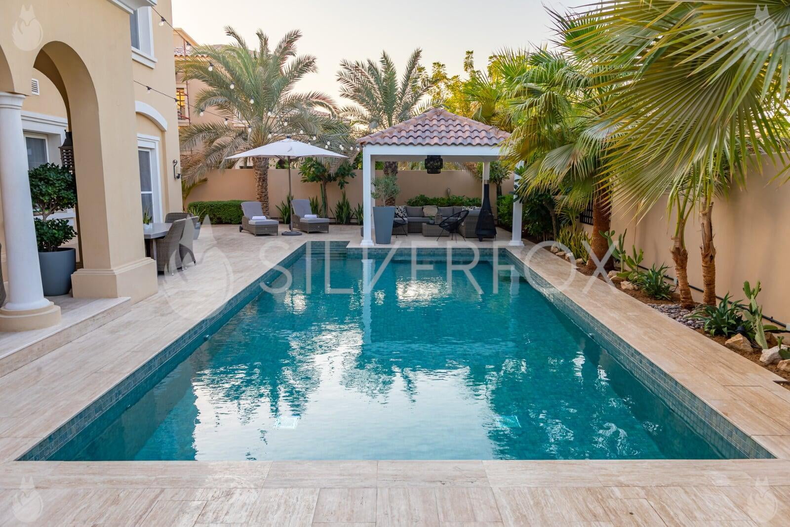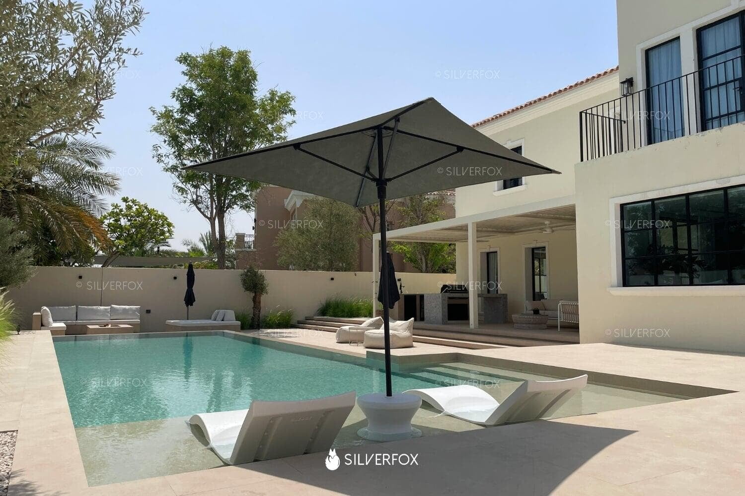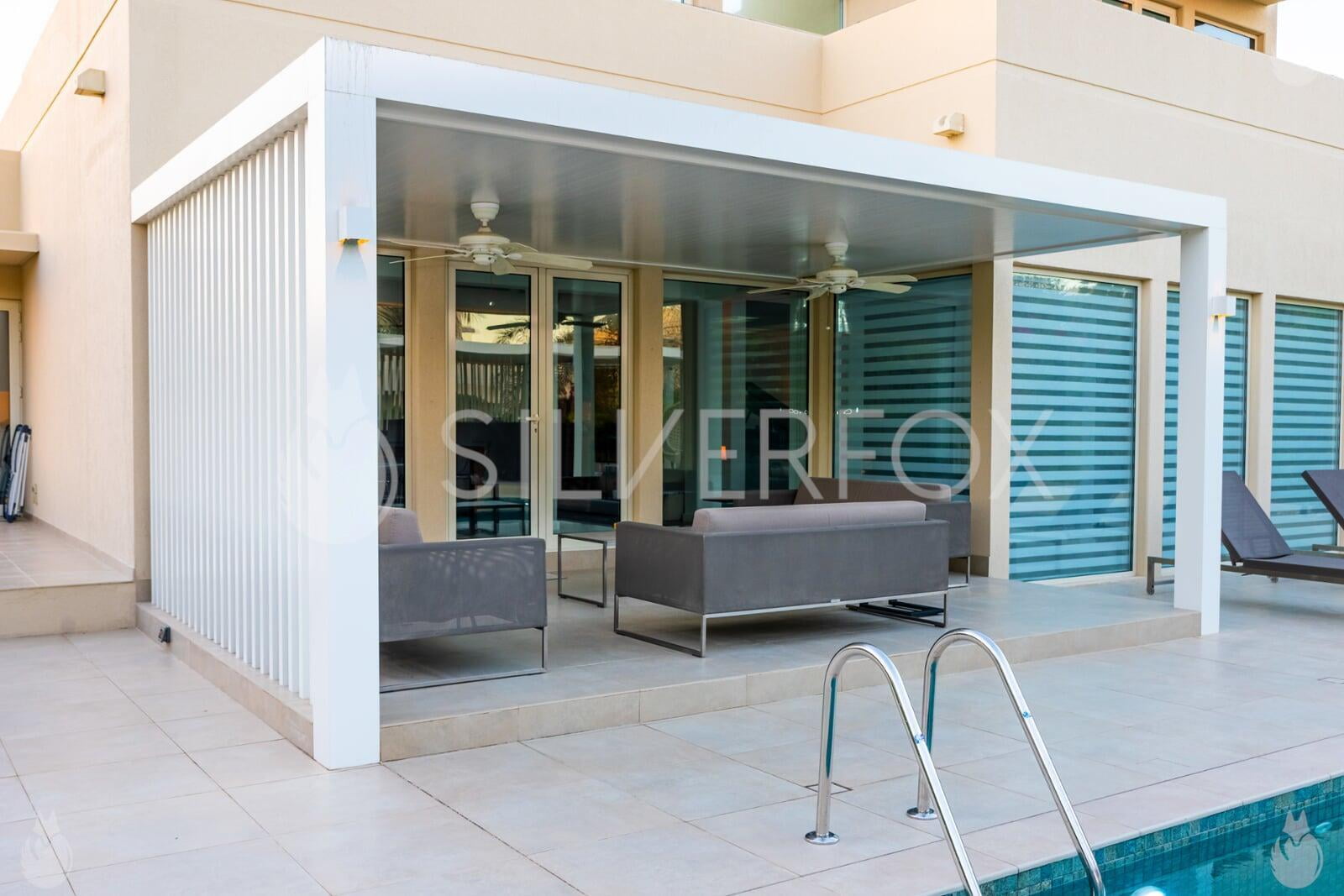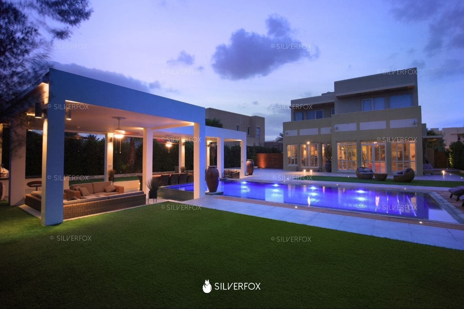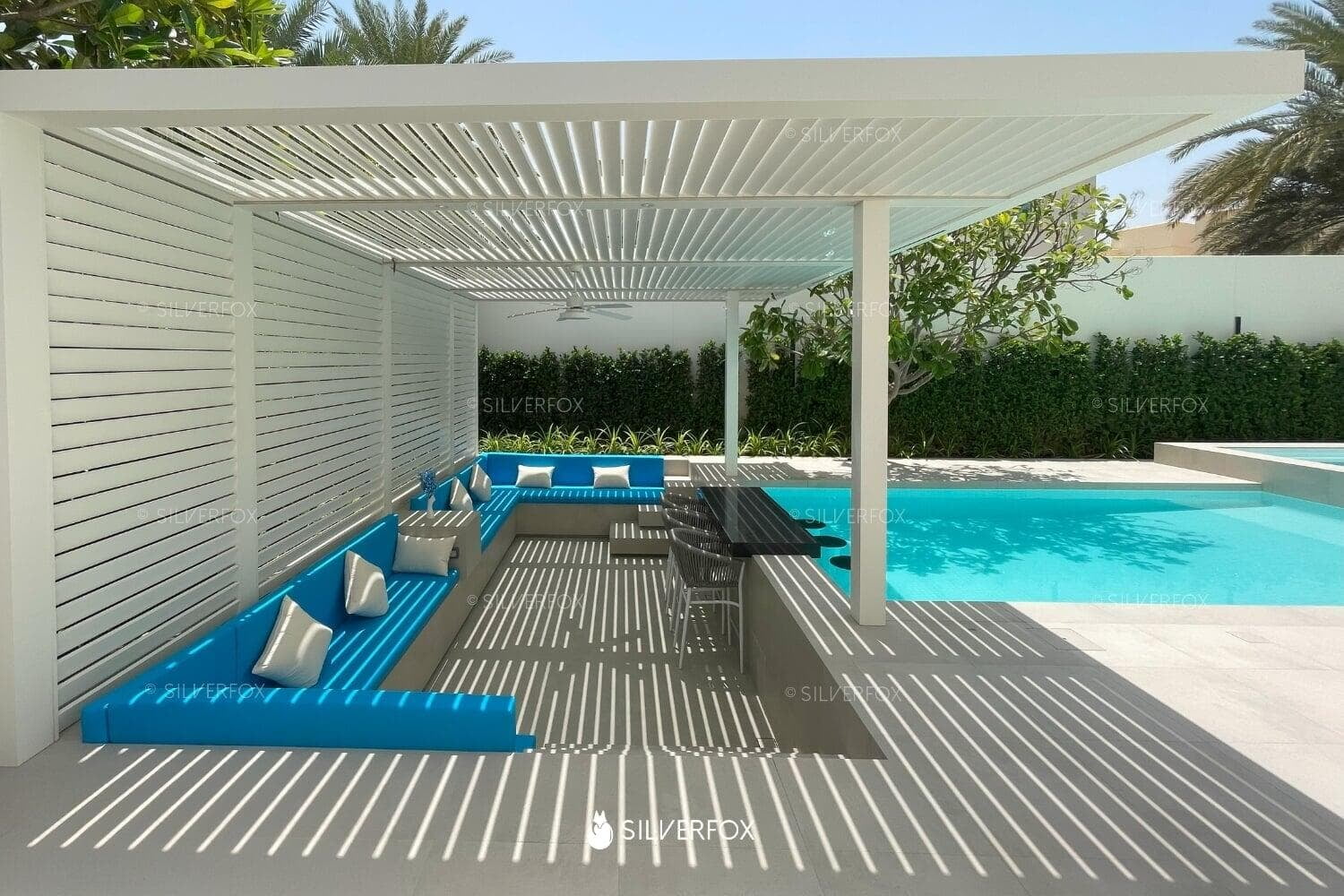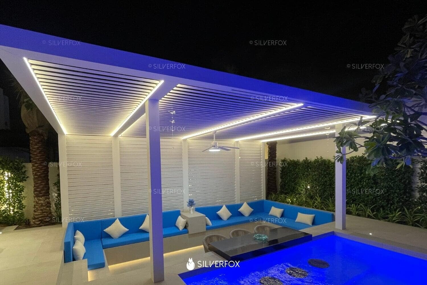 Residential Skimmer Pool with Steps, Water Feature, Decking, Outdoor Shower, Landscaping, Wooden Pump Room, & Outdoor Lighting