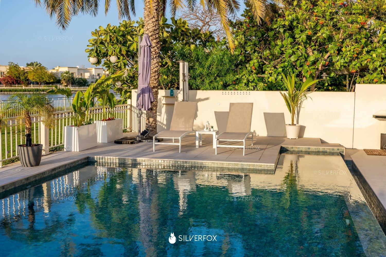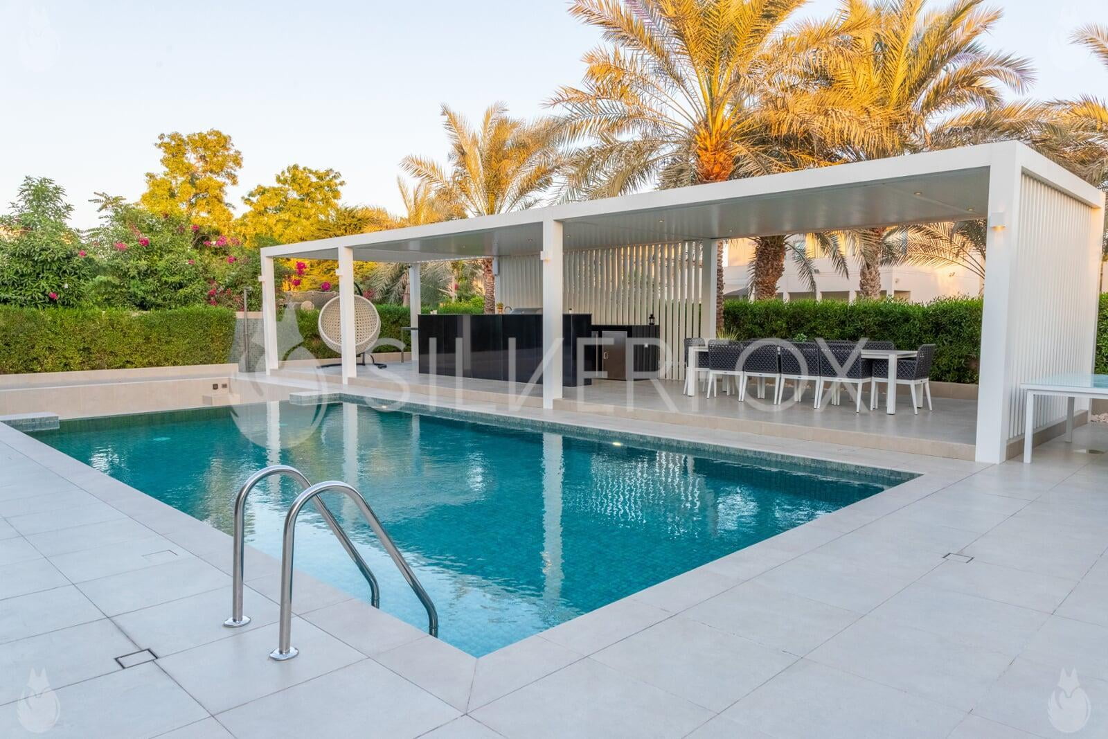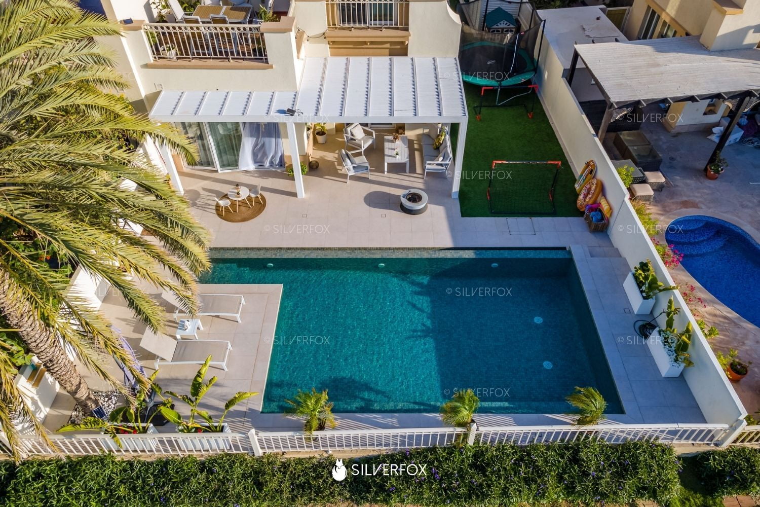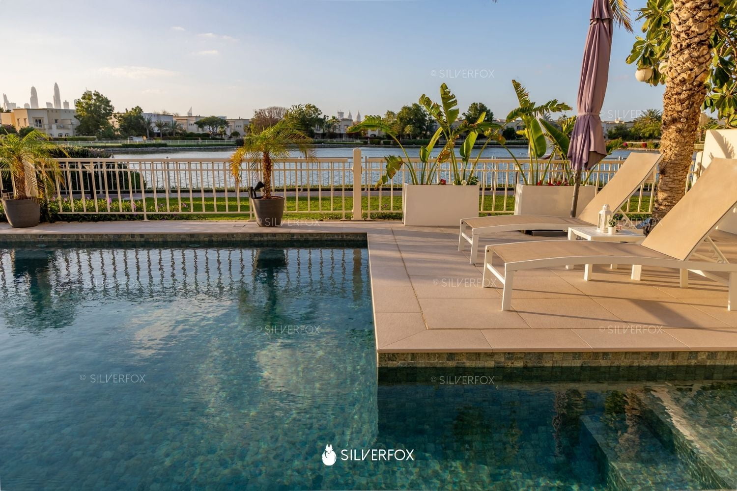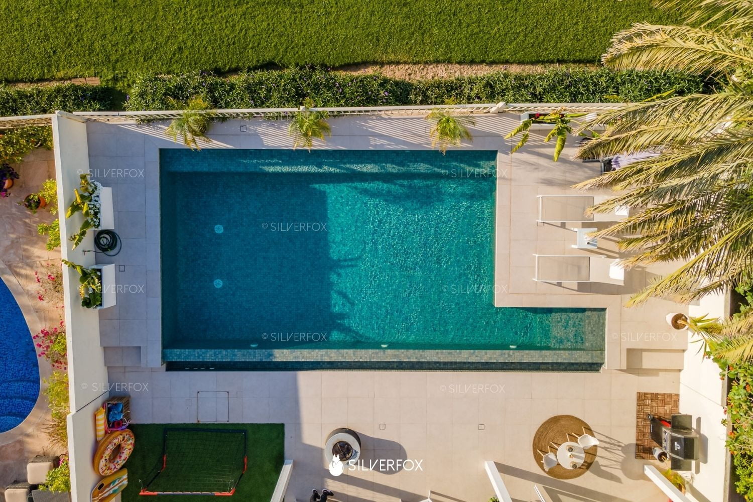 Residential Skimmer Pool with Steps, Water Feature, Decking, Outdoor Shower, Landscaping, Wooden Pump Room, & Outdoor Lighting
