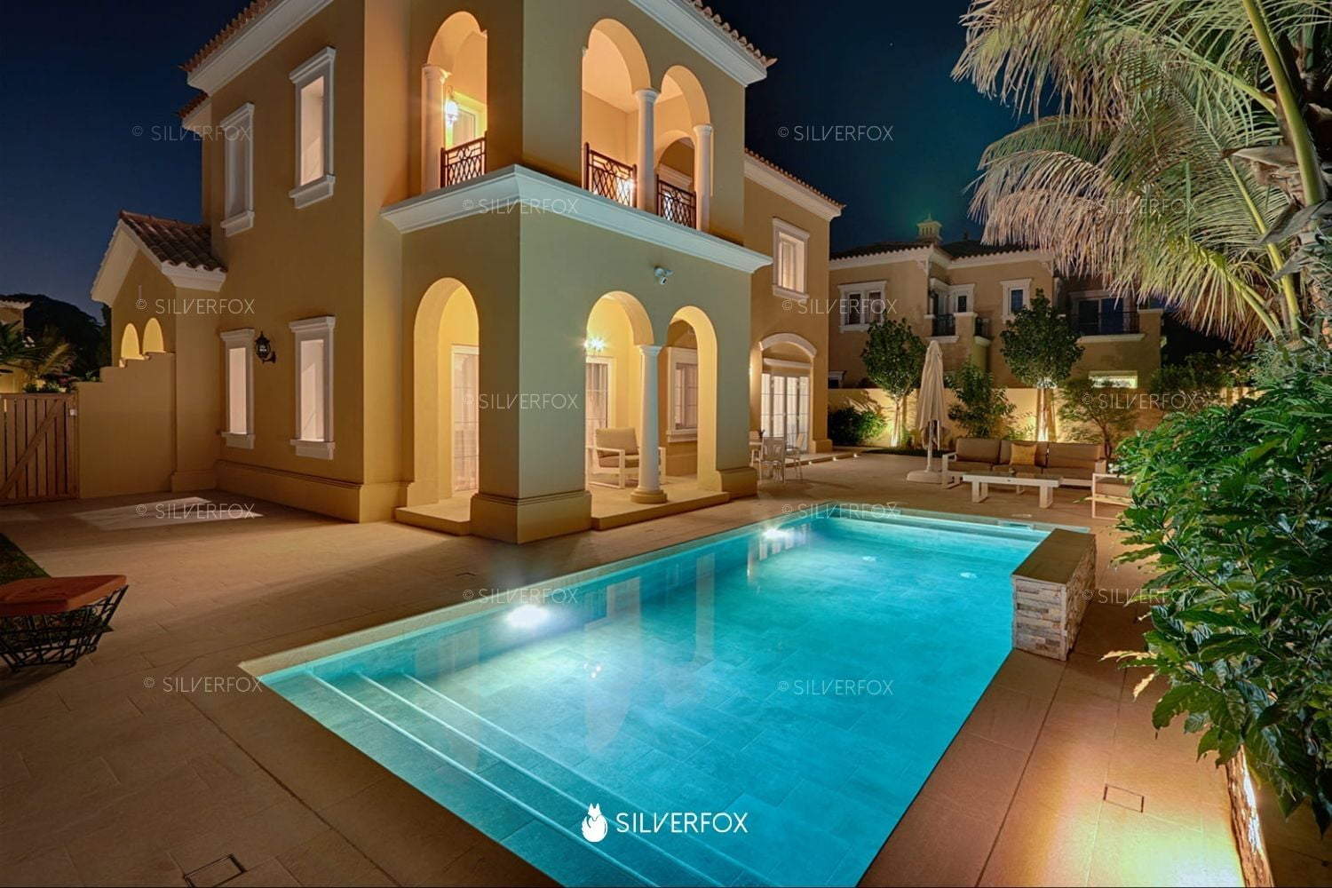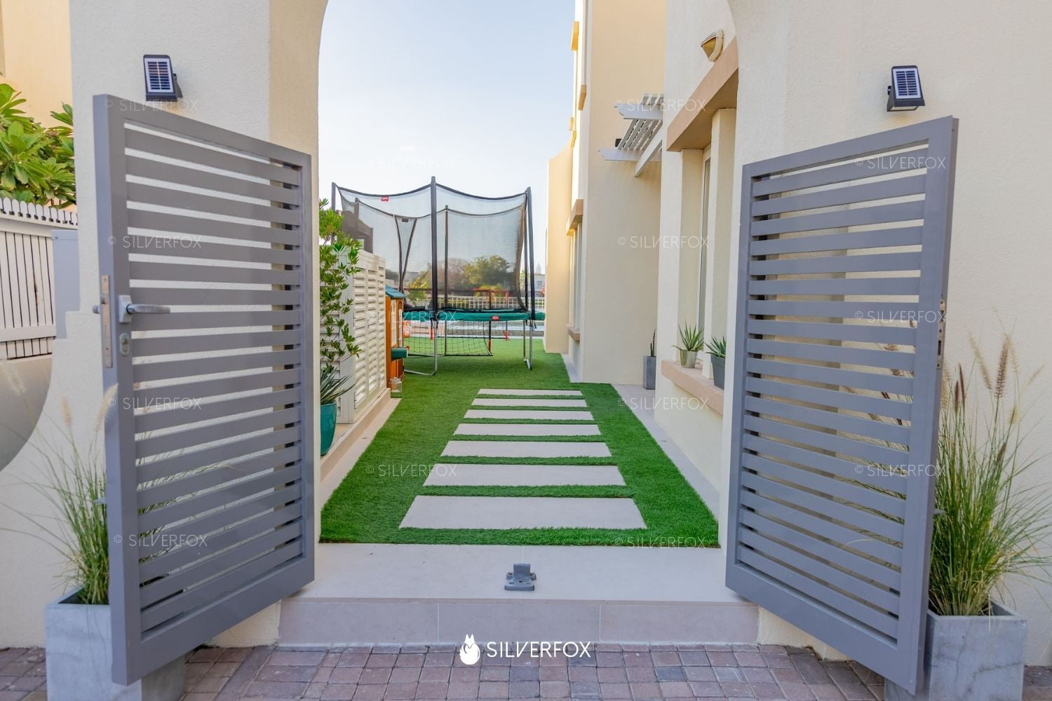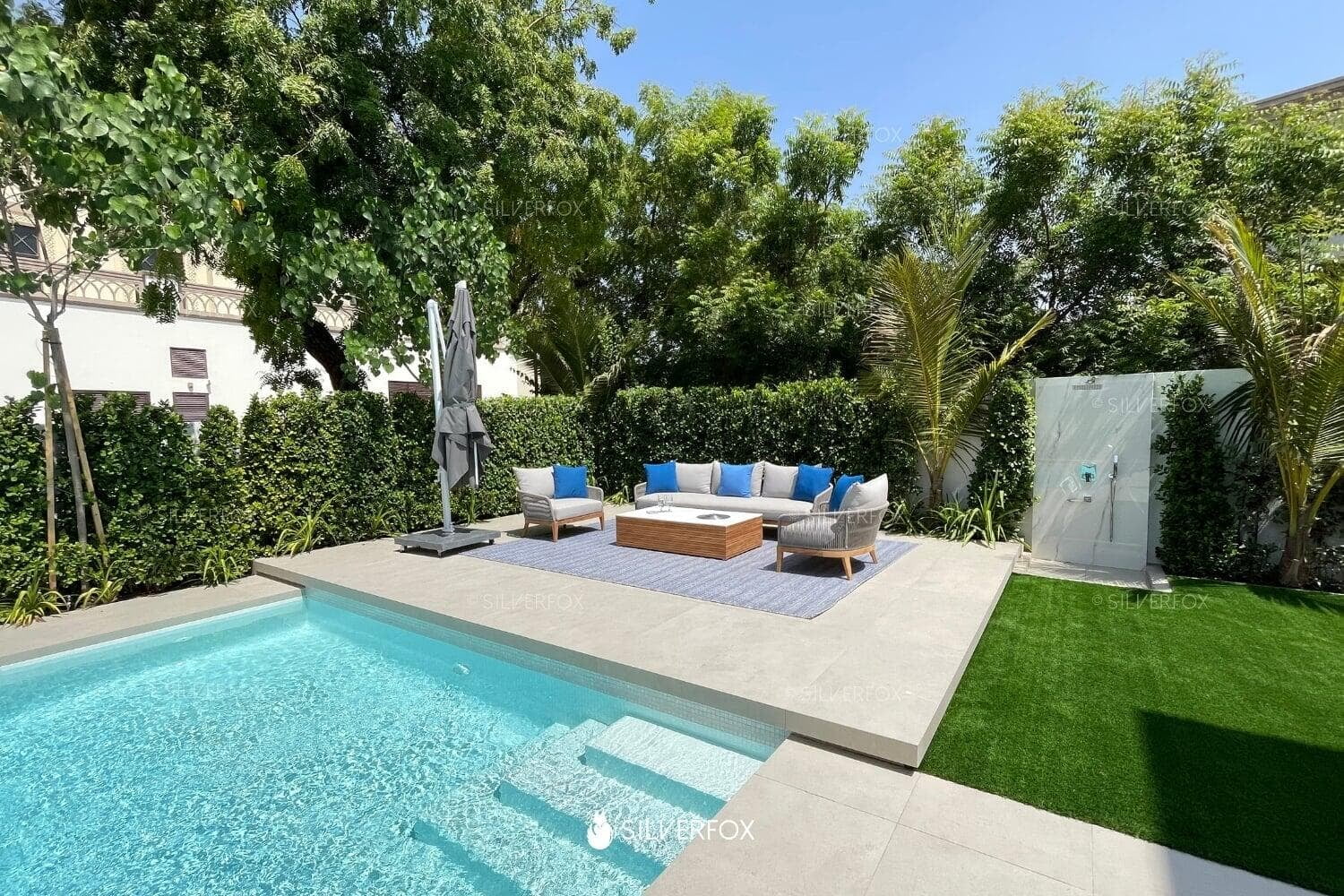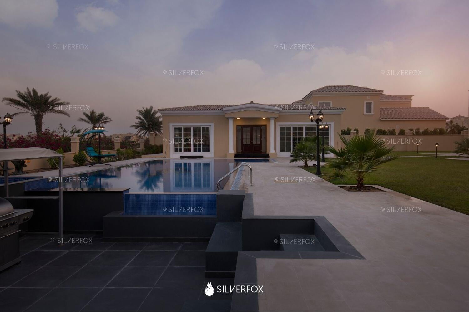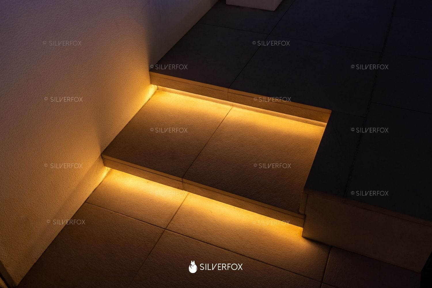 Residential Skimmer Pool with Steps, Water Feature, Decking, Outdoor Shower, Landscaping, Wooden Pump Room, & Outdoor Lighting